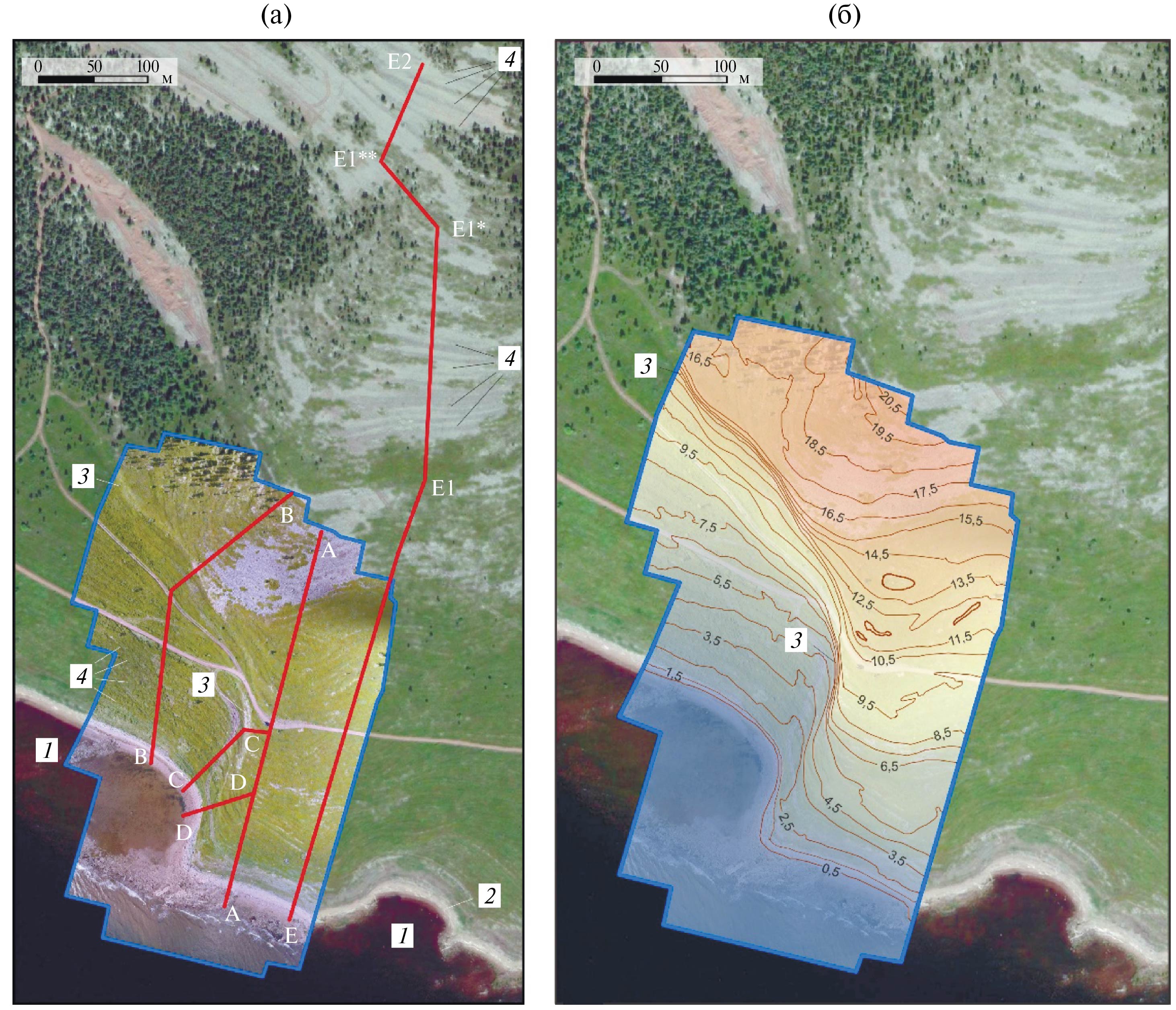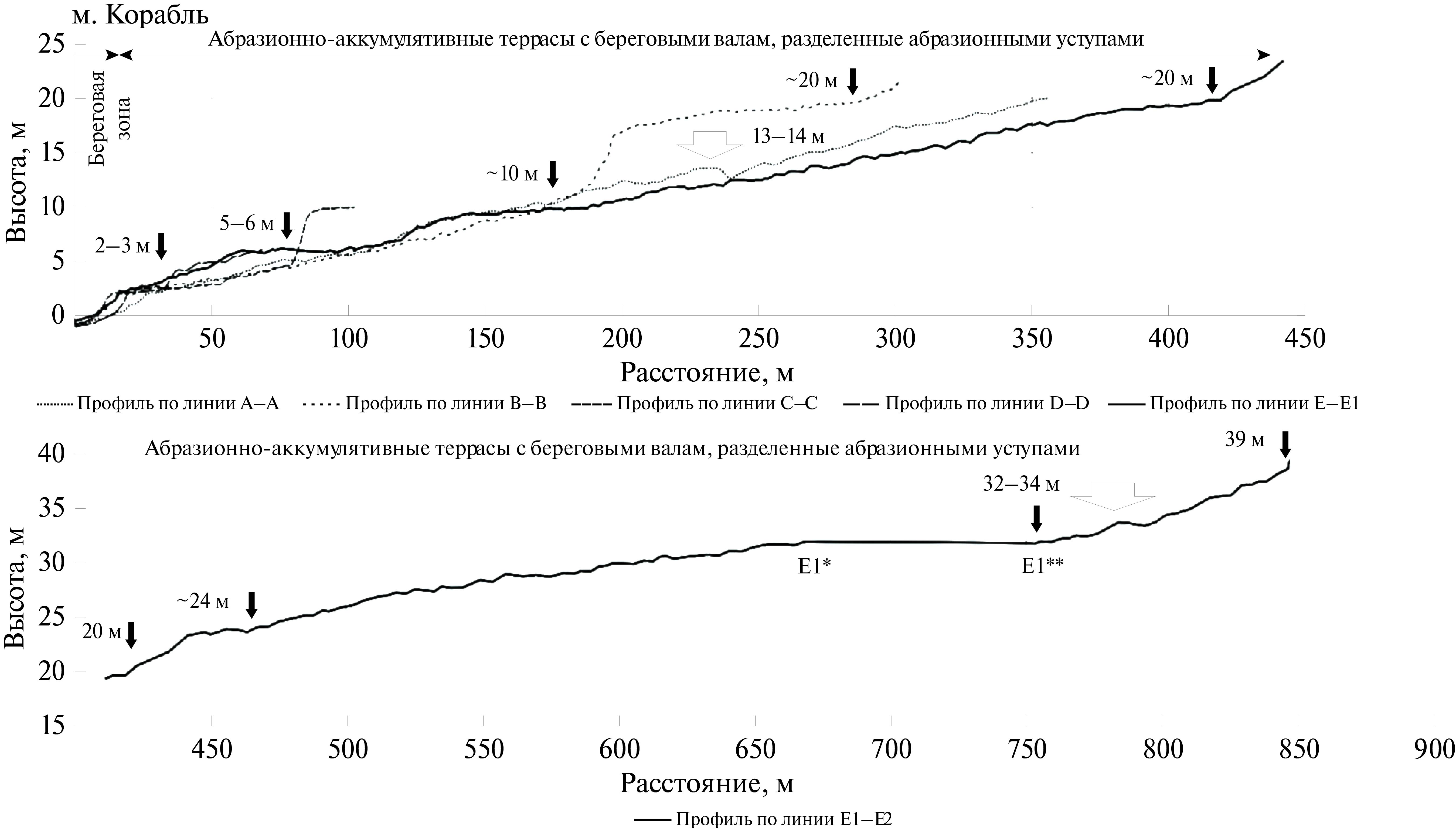 Планово-высотное положение береговых линий было уточнено в ходе полевых работ на типичных участках поднятых и отстающих в поднятии блоков (рис. 1, (в)). Для этого в районе м. Корабль, где сохранилась наиболее полная последовательность береговых линий, проведены аэрофотосъемка беспилотным летательным аппаратом (БПЛА) и тригонометрическое нивелирование (профиль Е), а в урочище Подтурок — тригонометрическое нивелирование (профиль F). Результаты съемок представлены в Балтийской системе нормальных высот.