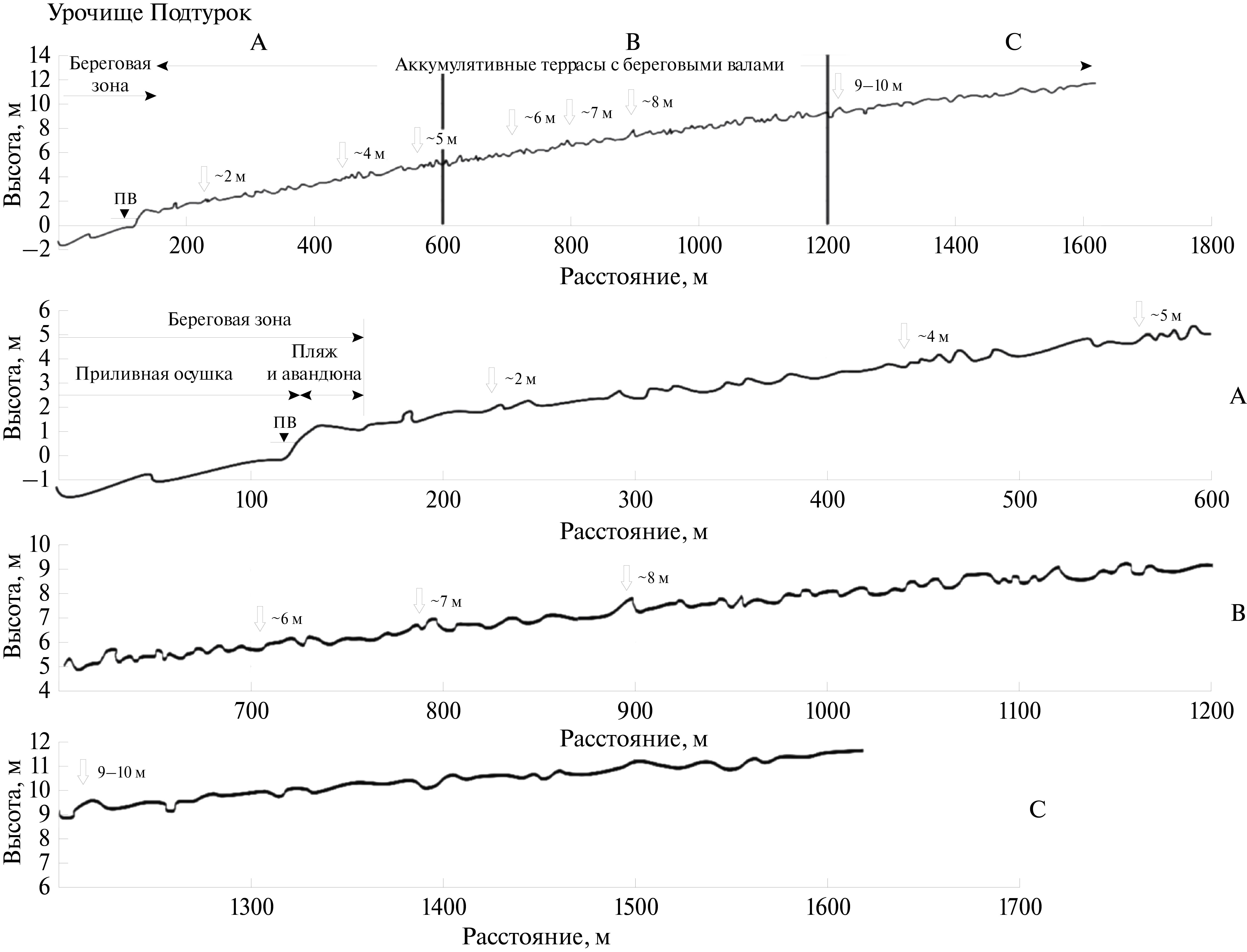 Тригонометрическое нивелирование было выполнено с использованием съемочного комплекса Trimble 5600. Точность определения углов составляет ±5ʺ, точность измерения расстояния по призме 3 мм + 3 ppm. Первичная обработка данных проводилась в специализированном программном обеспечении Trimble Business Center. В результате была определена высота характерных элементов рельефа береговой зоны (приливная осушка, пляж, авандюна), верхней границы экстремальных заплесков, а также расположенных на линиях профилей элементов берегового и эолового рельефа поднятых террас.