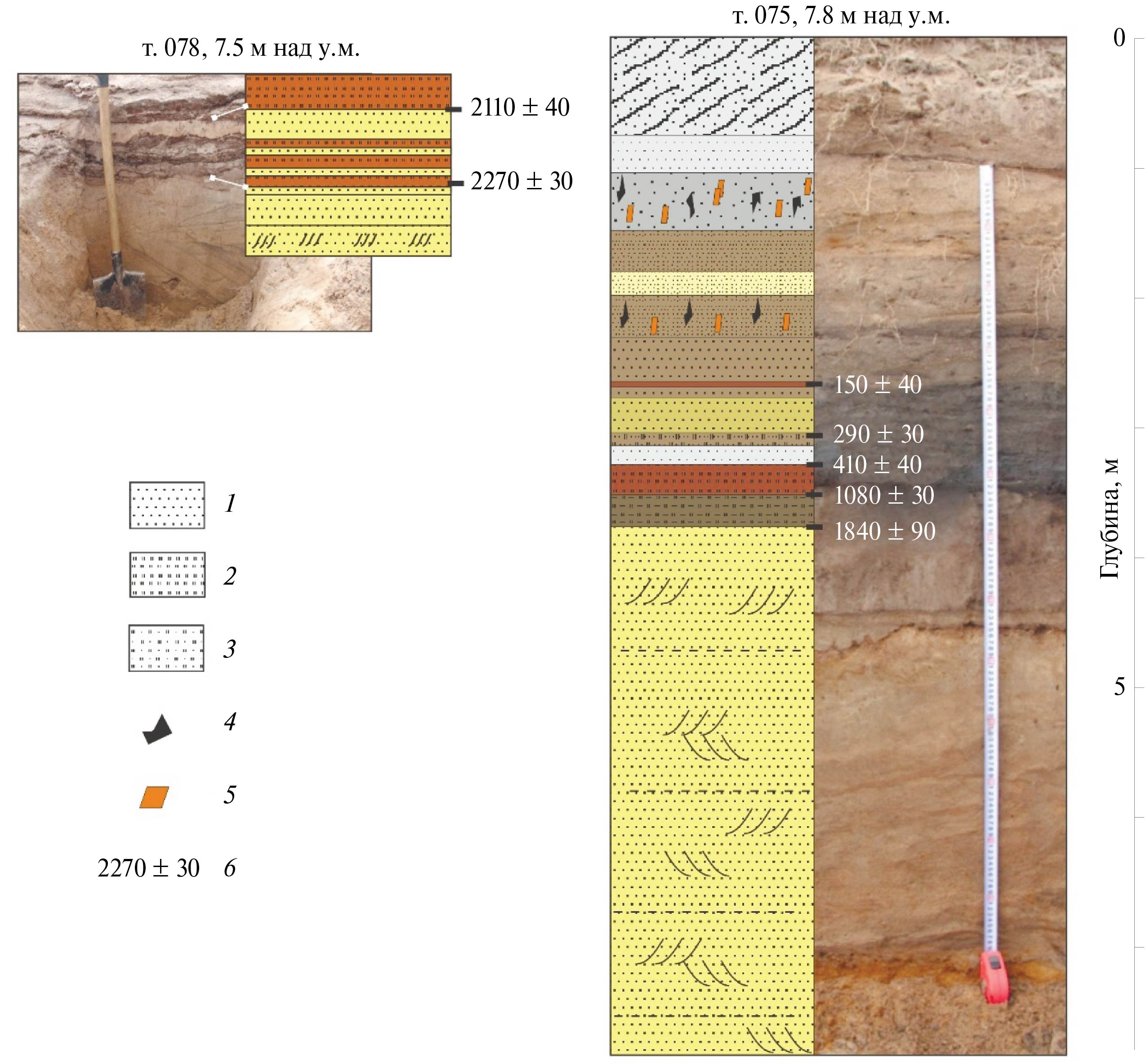 6 | т. 1057 | 30 | 0.5–0.6 | Торф / песок с прослоями суглинка | ИГАН-7498 | 1250±60 | 1270–1120 | 1290–1060 | 66.307080; 36.688780 | данная работа | |