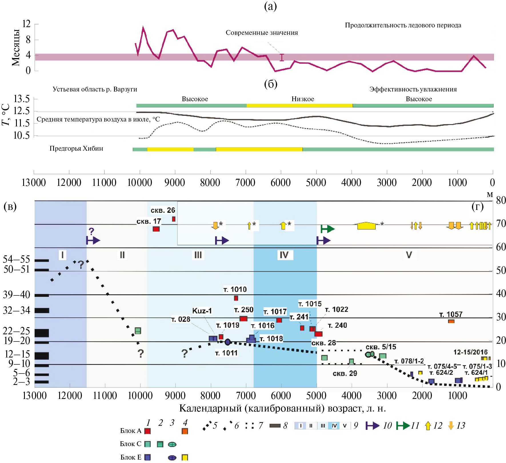 Показана существенная роль твердого стока рек в питании берегов Белого моря, сделано предположение об активизации береговых процессов в среднем голоцене (во время эвстатической трансгрессии Тапес) и в начале позднего голоцена (Невесский и др., 1977 и др.). Детальный геоморфологический анализ и радиоуглеродное датирование древних береговых линий1 показали, что в последние ~8.5 тыс. кал. л. н. ритмы береговых и устьевых процессов, а значит и интенсивность воздействия волн и стока рек, были не полностью синхронны даже на соседних участках побережья (Selivanov, 1996; Репкина и др., 2017; Зарецкая, 2018; Репкина и др., 2019; Репкина и др., 2020 и др.). Таким образом, анализ морфодинамики берегов позволяет дополнить данные об изменении в голоцене температуры, влажности (Елина и др., 2000 и др.) и водных масс Белого моря (Новичкова, 2008; Полякова и др., 2014 и др.) сведениями о ритмах ветроволнового режима и речного стока.