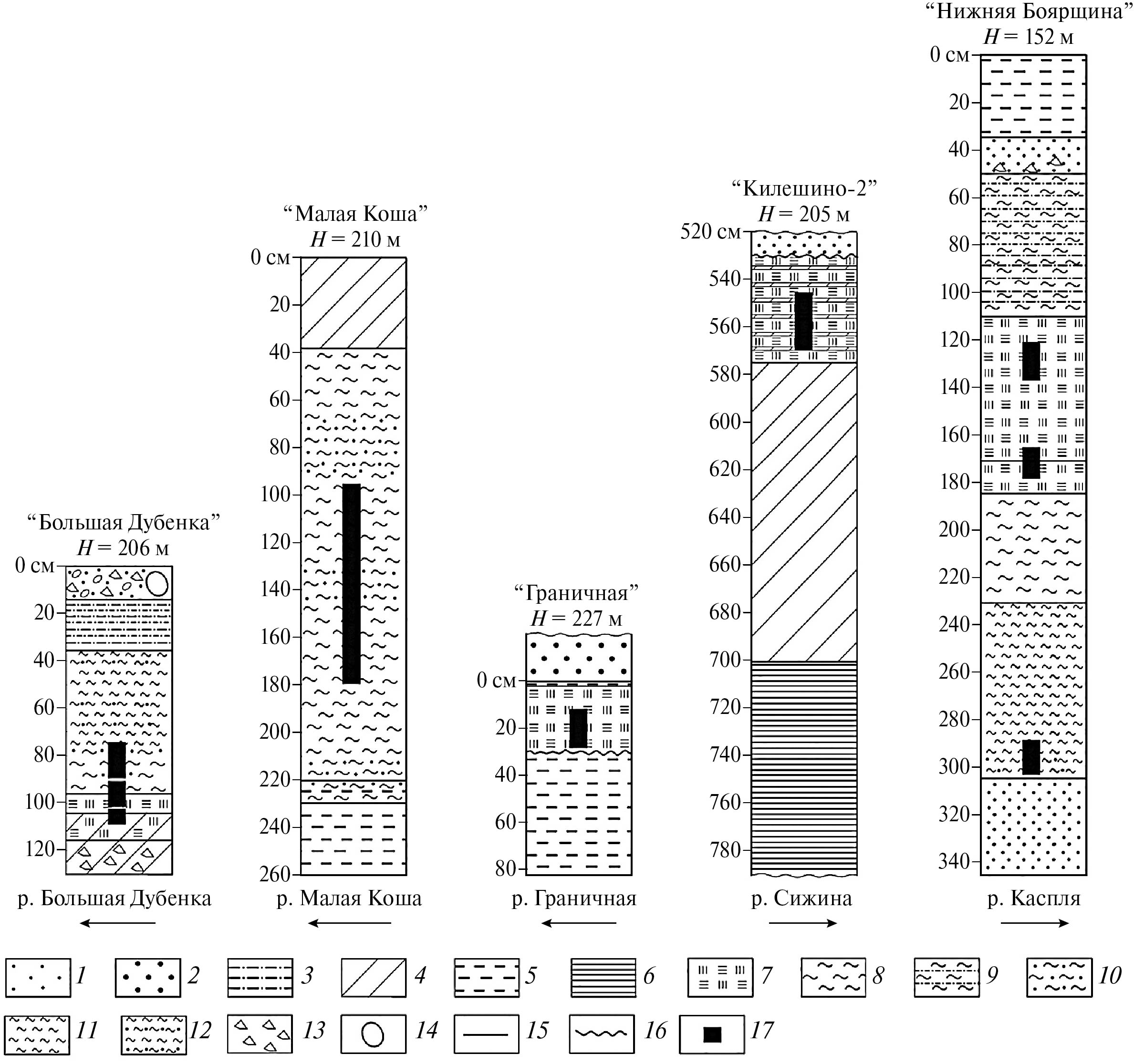 Fig. 2. Lithological cores of the “Bolshaya Dubenka”, “Malaya Kosha”, “Granichnaya”, “Kileshino-2” (Karpukhina et al., 2020) and “Nizhnyaya Boyarshchina” (Maksimov et al., 2022) sections. 1 — fine-grained sand; 2 — coarse sand; 3 — silts; 4 — loam; 5 — clay; 6 — rhythmically layered heavy loam; 7 — peat; 8 — gyttia; 9 — silty gyttia; 10 — sandy gyttia; 11 — dense gyttia; 12 — dense sandy gyttia; 13 — gravel; 14 — boulder; 15 — boundaries between layers; 16 — stratigraphic unconformity; 17 — ²³⁰Th/U age.