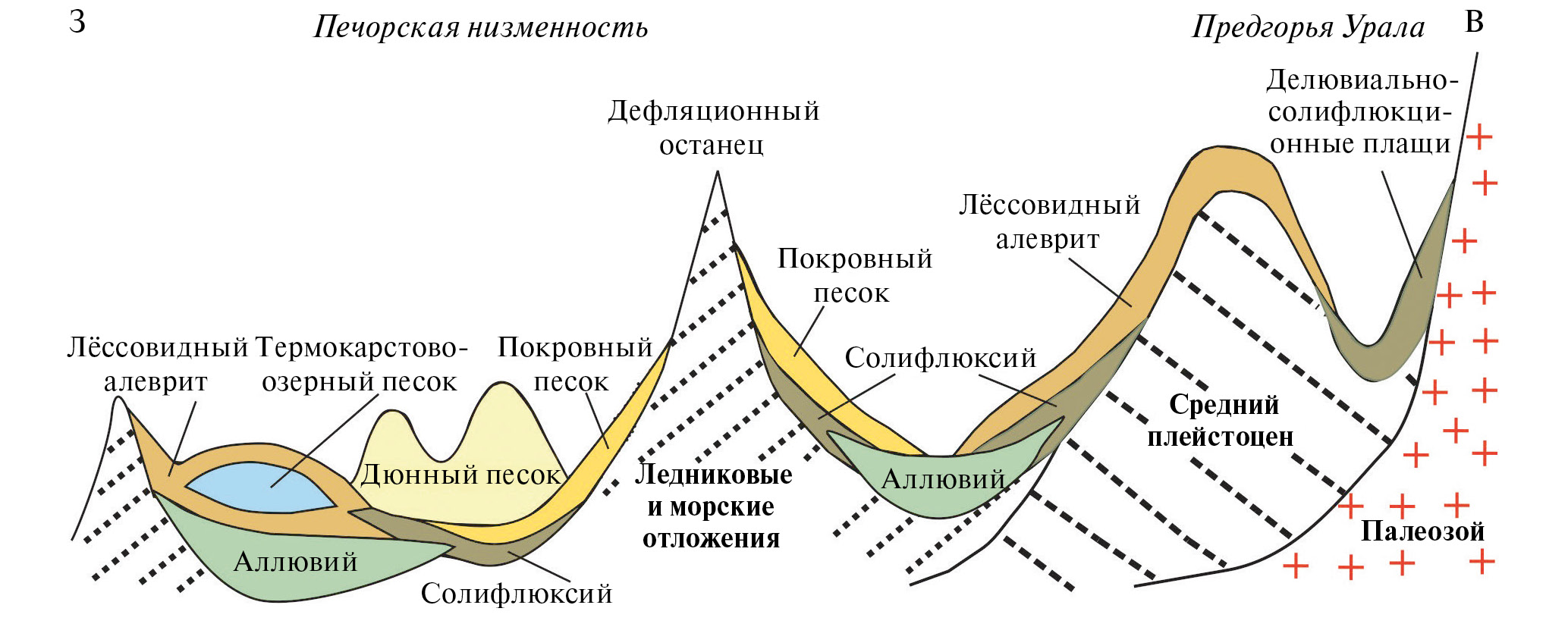 Рис. 3. Взаимоотношения перигляциальных образований верхнего неоплейстоцена на северо-востоке Европейской России (схематический профиль, модифицирован по (Астахов, Свенсен, 2011)).