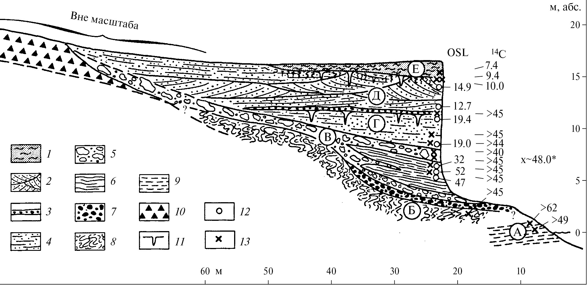Fig. 5. Section of sandy coastal lowland on Timan Beach (67°50ʹ N., 49°10ʹ E; TБ in fig. 1). Characteristic sequence of postglacial Pleistocene of the Lower Pechora: dominant aeolian sands underlain by limnic silts and sands with wisps of solifluction sediments by (Mangerud et al., 1999). 1 — peat; 2 — аeolian dune sands; 3 — pebble lag; 4 — аeolian horizontally bedded sands; 5 — solifluction diamicton; 6 — limnic laminated sands; 7 — cobble gravel; 8 — disturbed silts and sands; 9 — marine silt and clays; 10 — till; 11 — ice-wedge casts; 12 — OSL dates; 13 — ¹⁴C dates.