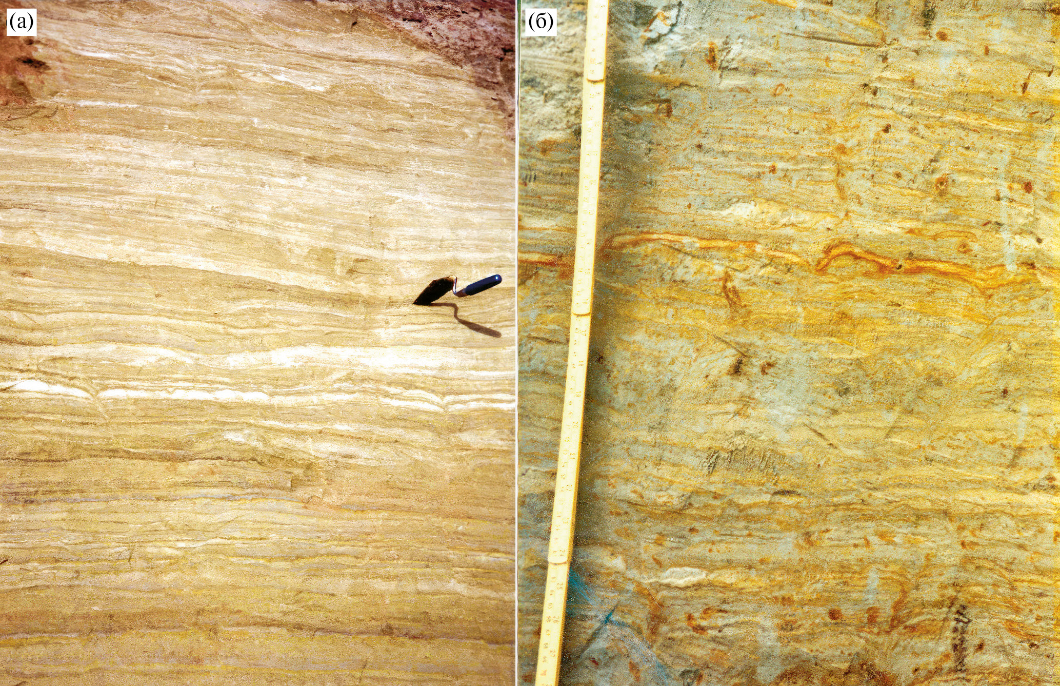 Рис. 7. Покровные пески нивейно-эолового происхождения. (а) — западный берег Коровинской губы в устье Печоры (68°25ʹ с. ш., 53°22ʹ в. д.; Ко на рис. 1), (б) — карьер в Аксарке, правый берег Оби (Полярный круг; Ак на рис. 1) (Astakhov, 2014). Типичны резкие контакты между слойками тонкого песка и темного алеврита, мелкие морозные трещины (а), каплевидные нарушения и травянистые корнеходы (б).