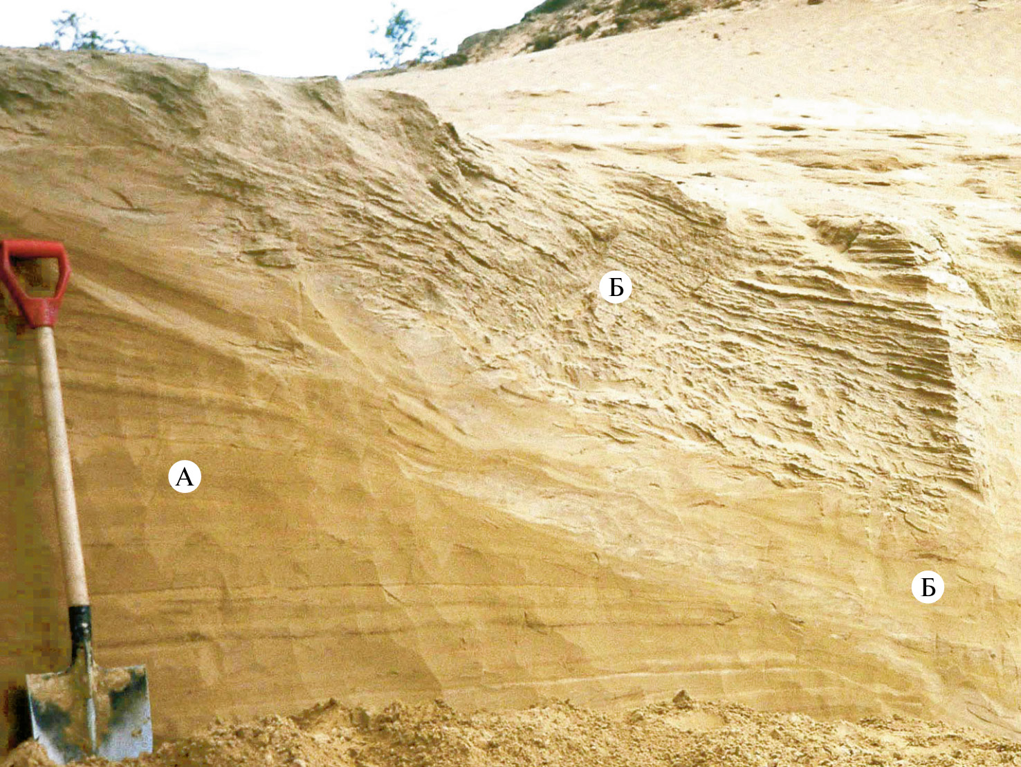 Fig. 8. Finely stratified, dense coversand (А), overlain by diagonally bedded loose dune sand (Б) on Kuya River near the bridge (67°33ʹ N, 53°20ʹ E; K in fig. 1).