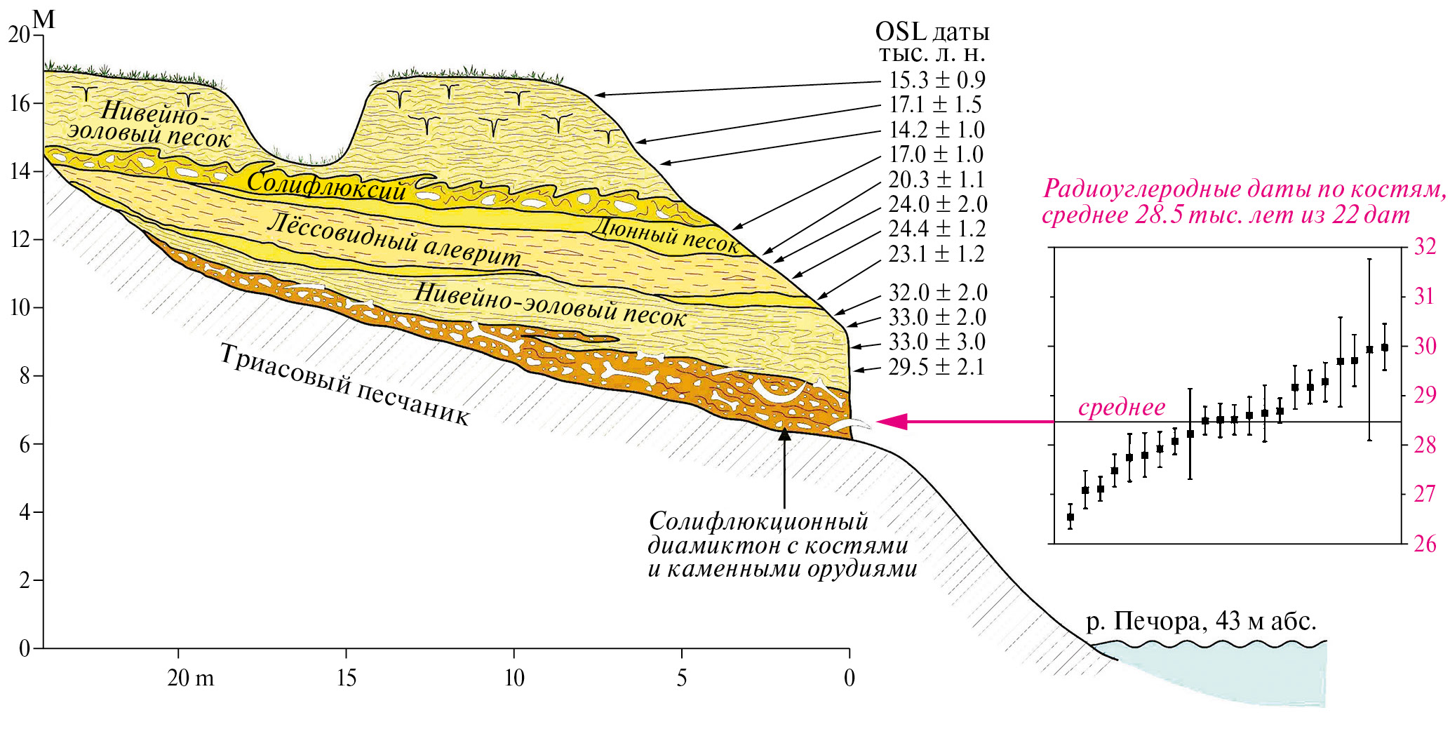 При этом дюнные пески чаще налегают на покровный слой (рис. 5, 8). Относительно более молодой возраст дюнных скоплений подтвержден и хронометрией. Из покровного песка термолюминесцентные даты в разрезе Мархида (Ма на рис. 1) показали 14.9—12.5 тыс. л., а более современный оптико-люминесцентный (OSL) метод на Тиманском Берегу (ТБ на рис. 1) показал возраст около 19 тыс. л. (Mangerud et al., 1999). OSL даты из нивейно-эоловых песков дали возрасты 20 и 17 тыс. л. за Уралом (Astakhov, 2014), а на палеолитических стоянках Мамонтовая Курья и Бызовая (МК и Б на рис. 1) — 20—14 тыс. л. в верхах разреза (Свенсен и др., 2008) и 32—29.5 тыс. л. в нижней нивейно-эоловой пачке Бызовой (рис. 9).