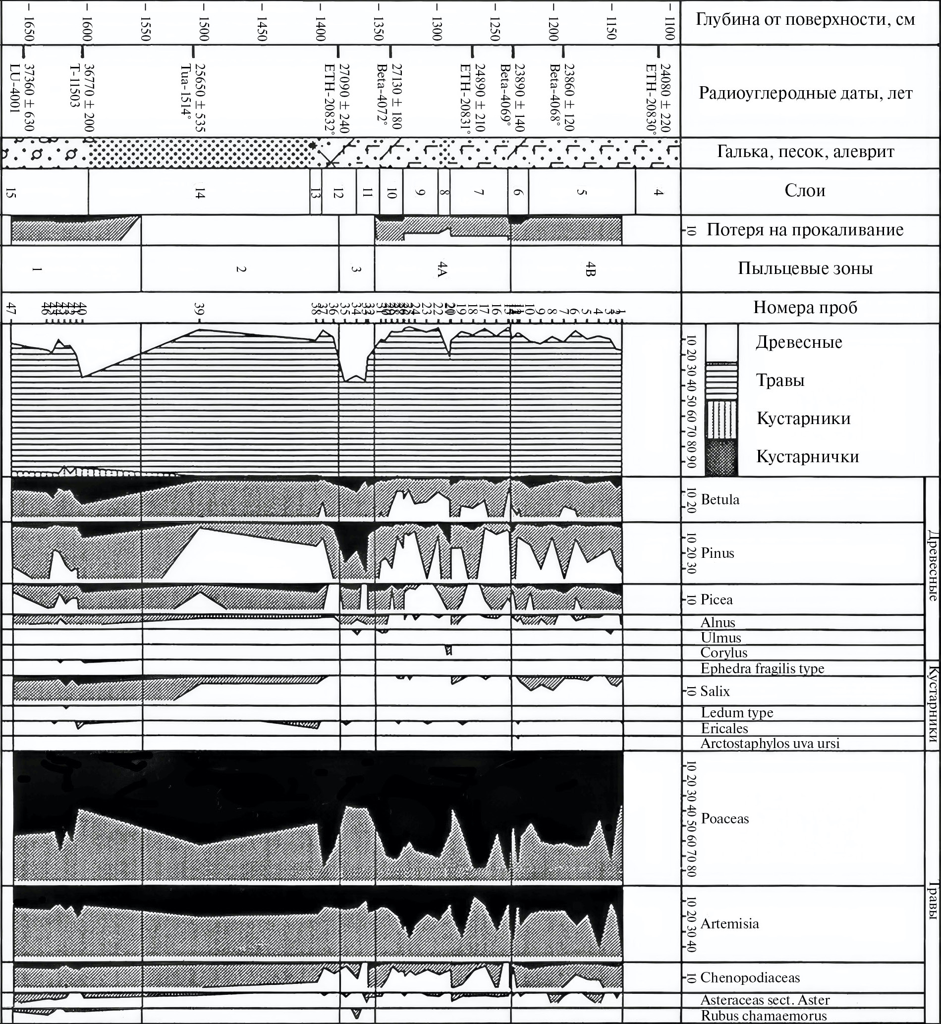 В ключевых для понимания палеогеографии позднего неоплейстоцена разрезах 2-й террасы, описанного выше на Широтной Оби, 61° с. ш. (Астахов, 1989), и на Тоболе, 57,5° с. ш. (Каплянская, Тарноградский, 1974), наблюдаются русловые и пойменные фации, а также старичные глины, характерные для перстративного типа аккумуляции. В разрезе у с. Липовки на Тоболе старичные глины перекрыты лёссовидными алевритами мощностью 15 м с прослоем тонкого песка и тундровыми почвами и псевдоморфозами. По инситным лиственничным пням (горизонт П на рис. 16) были получены надежные ¹⁴C-даты 32.770±240 (ЛУ-6027), 32 640±380 (ЛУ-6026), 32 520±230 (ЛУ-6029), 31 760±230 (ЛУ-6028) лет (интервал 37—34.5 калиброванных тыс. л.) (Арсланов и др., 2009). Этот разрез на основании единичных пыльцевых спектров с елью послужил Н.В. Кинд (1974) поводом для выделения “липовско-новоселовского потепления” в интервале 30—22¹⁴C (34.5—26 калиброванных) тыс. л. Хотя обнажение расположено в липовой роще на южном краю тайги, макроостатки растений и тундровые почвы указывают на прежнюю лесотундровую зону, т.е. на смещение растительных зон 35—37 тыс. л. н. на 800—900 км к югу. Наконец, сеть псевдоморфоз по повторно-жильным льдам — бесспорный климатический индикатор — здесь обнаружена в 1000 км к югу от современной полигональной тундры, что говорит о резко континентальном климате с монолитной мерзлотой в липовском интерстадиале (Каплянская, Тарноградский, 1974). Таким образом, надежные индикаторы вместо гипотетического потепления говорят нам о перигляциальной обстановке никак не теплее палеомерзлотных условий среднего пленигляциала Центральной Европы.