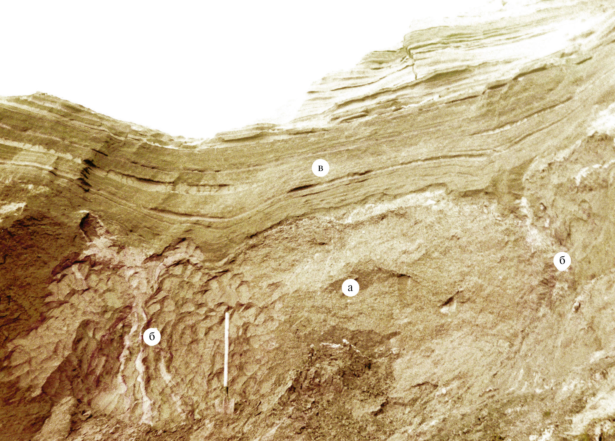 - Массивные пятнистые прослои толщиной 10—15 см с трещинами и железистыми пятнами — признаками криоаридного педогенеза.