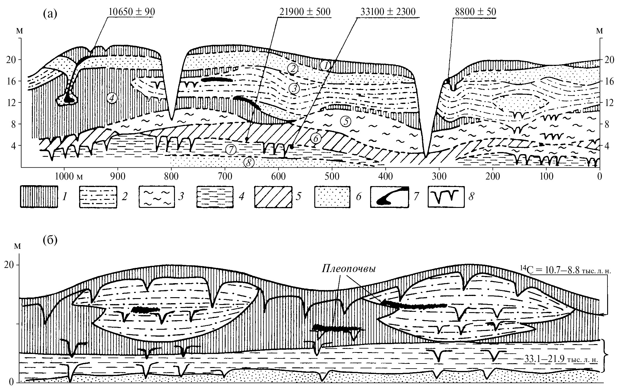 Под местом отбора пробы для последней даты наблюдалась необычная структура, однозначно указывающая на субаэральное происхождение лёссовидной толщи. Это субвертикальное тело голоценового древесного торфа, мощность которого нарастает вниз от 5—10 см до 50 см на глубине 9—10 м. Рубашку торфяной жилы образуют согласно с ней падающие пески пачки 2. На глубине 9—10 м эти пески и торф скучиваются в гофрированную деляпсивную брекчию, образующую гнездо не менее 4 м в поперечнике. Это очевидно суффозионная каверна, соединенная с подошвой пачки 1 расширяющимся кверху понором. Современные суффозионные воронки глубиной 1—2 м в изобилии наблюдаются на этой террасовидной поверхности. Вполне вероятно, что вытаявшие жильные льды предшествовали суффозионным просадкам и явились очагами инфильтрации грунтовых вод и коррозии лёссовидного алеврита (Астахов, 1989).
