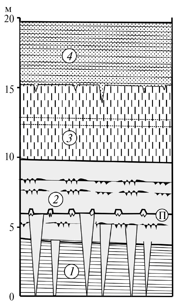 Fig. 16. Sedimentary sequence of the 2nd terrace of Tobol River on eastern bank near settlement Lipovka (57°50ʹ N; Ли in fig. 1) simplified after (Kaplyanskaya, Tarnogradsky, 1974). 1 — oxbow-lake clay cut by ice-wedge casts, 2 — conterminal unit: massive silts with tundra paleosols and a horizon of rooted larch stumps (П), 3 — sandy silt with interlayers of fine sand, 4 — laminated fine sand with silt seams.