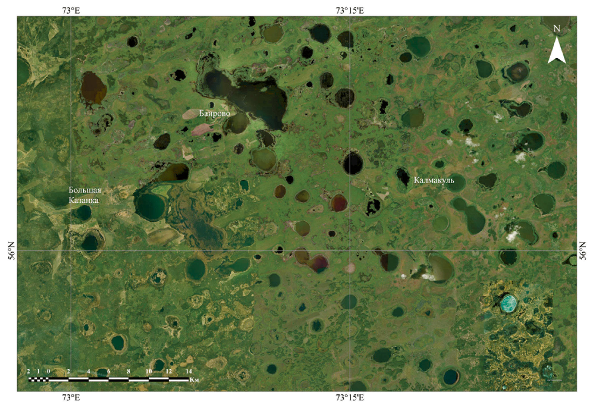 Fig. 2. Deflationary relief of the time of the last glaciation in the western part of the Kulunda Plain with a large number of small rounded basins blown by the wind and filled with water in Holocene (source: ArcGIS Earth).