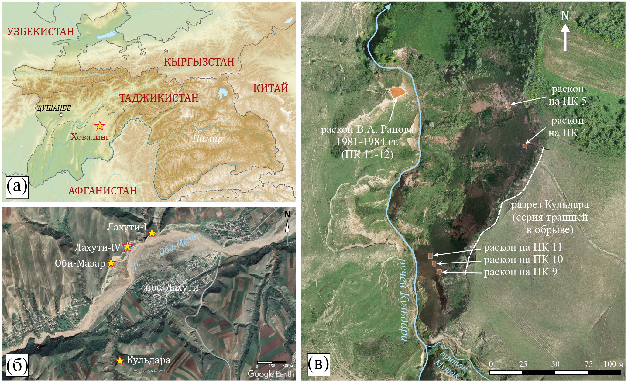 Рис. 1. Расположение региона исследования (стоянки Кульдара) на карте Таджикистана (а), положение стоянки и опорных памятников лёссового палеолита долины р. Оби-Мазар (б) и археологических раскопов 1981—1984 гг. и 2021 г. на ортофотоплане цифровой модели местности (в).
