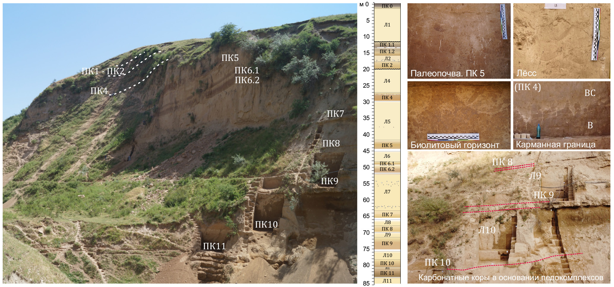 Расчистка обнажения осуществлялась подготовкой траншей и закладкой археологических раскопов (на ПК 4, 5, 9, 10 и 11). Соотнесение участков между собой производилось по маркирующим кальцитовым горизонтам в основании педокомплексов (рис. 2). Для отложений было выполнено подробное литологическое и макроморфологическое описание палеопочв и лёссов, проводимое П.М. Сосиным по российской системе, описанной в “Почвенной съемке” (1959) (Розанов, 2004), после актуализированное по международной классификации WRB (2022). Полевое измерение значений магнитной восприимчивости производилось при помощи портативного каппаметра ПИМВ (Геодевайс, Россия) и выполнялось сплошным образом на всю мощность разреза с шагом каждые 3 см. На участках карбонатных кор в основании ПК сплошные измерения не проводились, и были получены лишь единичные данные, где было возможно обеспечить плотное прилегание измерительной поверхности прибора для выполнения замера.