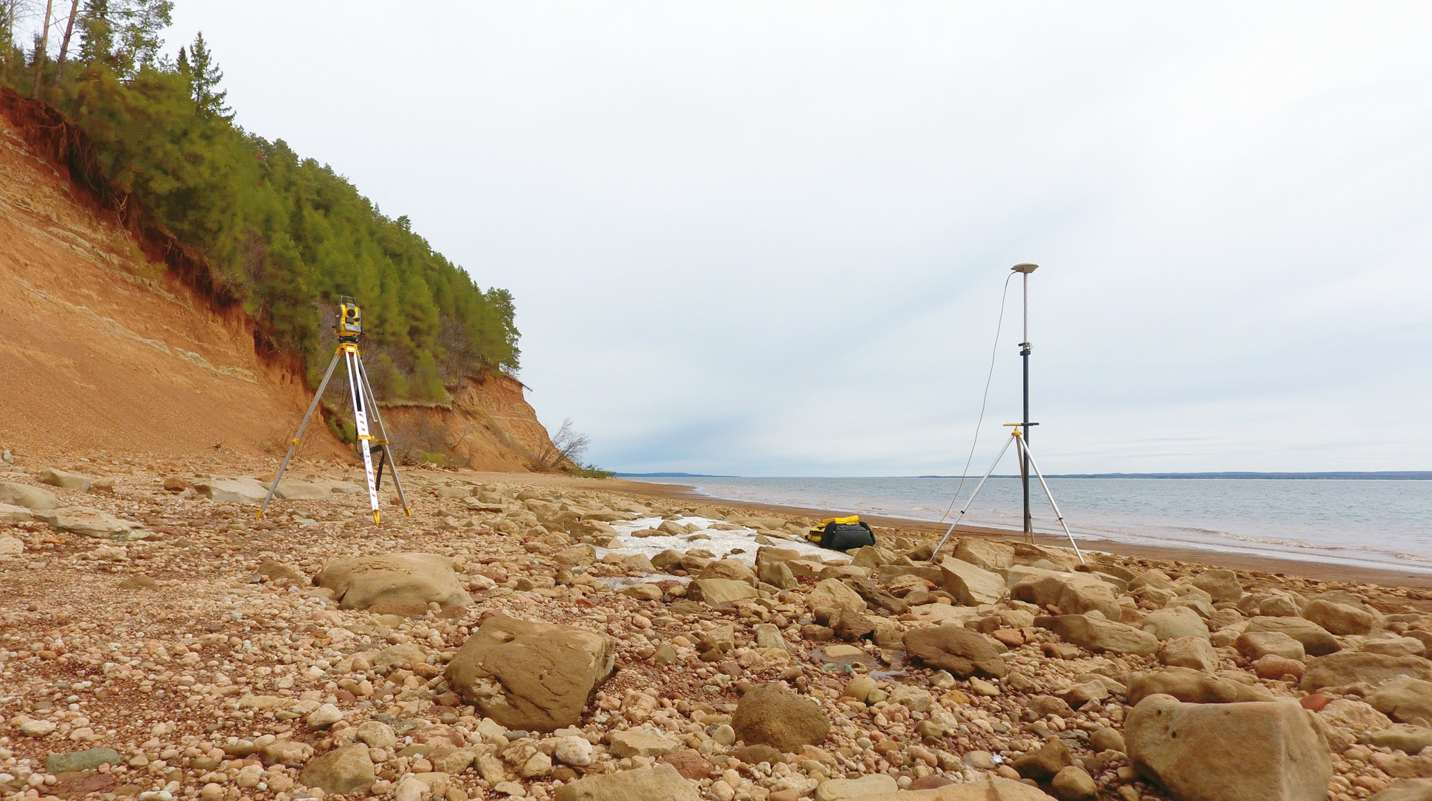 Склон подводного мелководья ровный, прямой, крутизной 4—5°, полностью сложен коренными алевролитами. Обычно поверхность коренных алевролитов, за исключением периода весеннего сброса воды на водохранилище, бывает перекрыта маломощным подвижным слоем рыхлых отложений. Скорость размыва коренных пород прибрежной отмели определялась методом шпилек, забитых в грунт по створам на разном удалении от подножья абразионно-осыпного склона. Скорость и направление смещения обломков горных пород на прибрежном мелководье определялись различными методами. Первоначально это было сделано с помощью меток — просверленных отверстий на поверхности крупных обломков. В дальнейшем, при проведении повторной высокоточной тахеометрической съемки, вычислялись новые координаты этих меток. Подобная методика применялась с 2015 по 2020 гг. Такой прием оказался недостаточно эффективным не столько из-за сравнительно высокой трудоемкости, сколько из-за сложности поиска и идентификации обломков. Тем не менее, некоторые предварительные результаты удалось этим методом получить, и они были опубликованы (Егоров и др., 2018; 2019).
