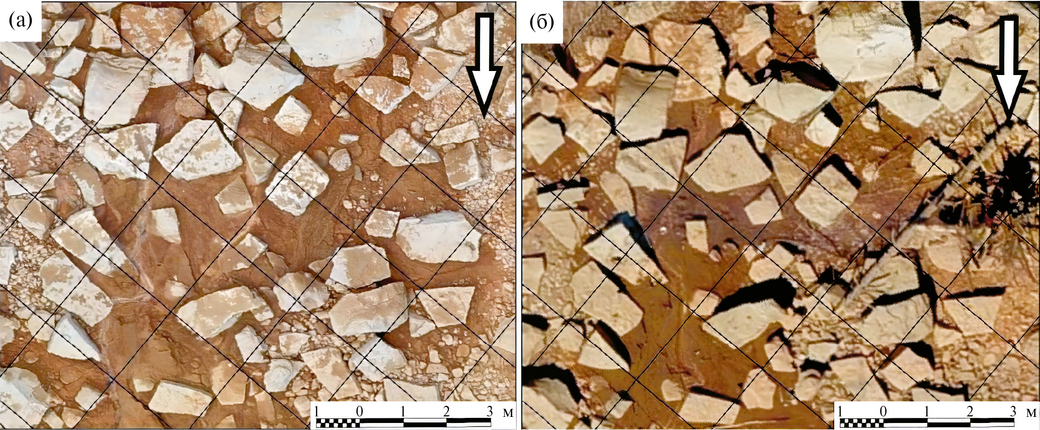 Рис. 3. Аэрофотоснимок фрагмента прибрежной полосы Воткинского водохранилища (координатная сетка проведена через 2 м, стрелкой указано направление уклона): (а) — 2021 г., (б) — 2022 г.