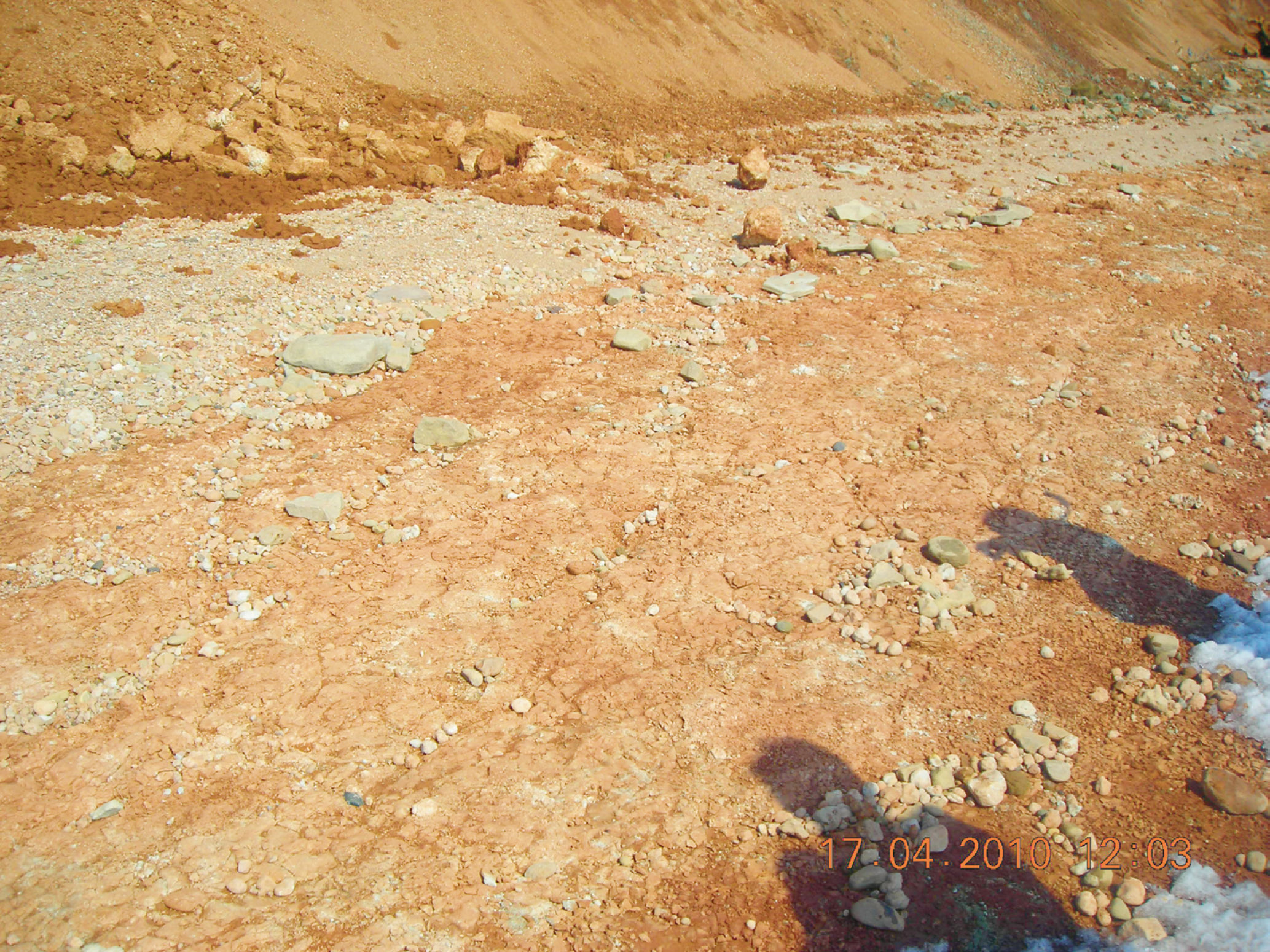 Судя по ширине прибрежной полосы, лишенной чехла рыхлых наносов, расстояние, на которое происходит смещение наиболее мелких фракций рыхлых отложений, может достигать 20 м и более. Слой рыхлых наносов весной сохраняется только у подножья абразионно-осыпного склона, поскольку промерзает в период ледостава. Учитывая продолжительность ледостава и дальность переноса, скорость смещения рыхлых отложений наиболее мелких фракций может составлять от 3 до 4 м/мес.
