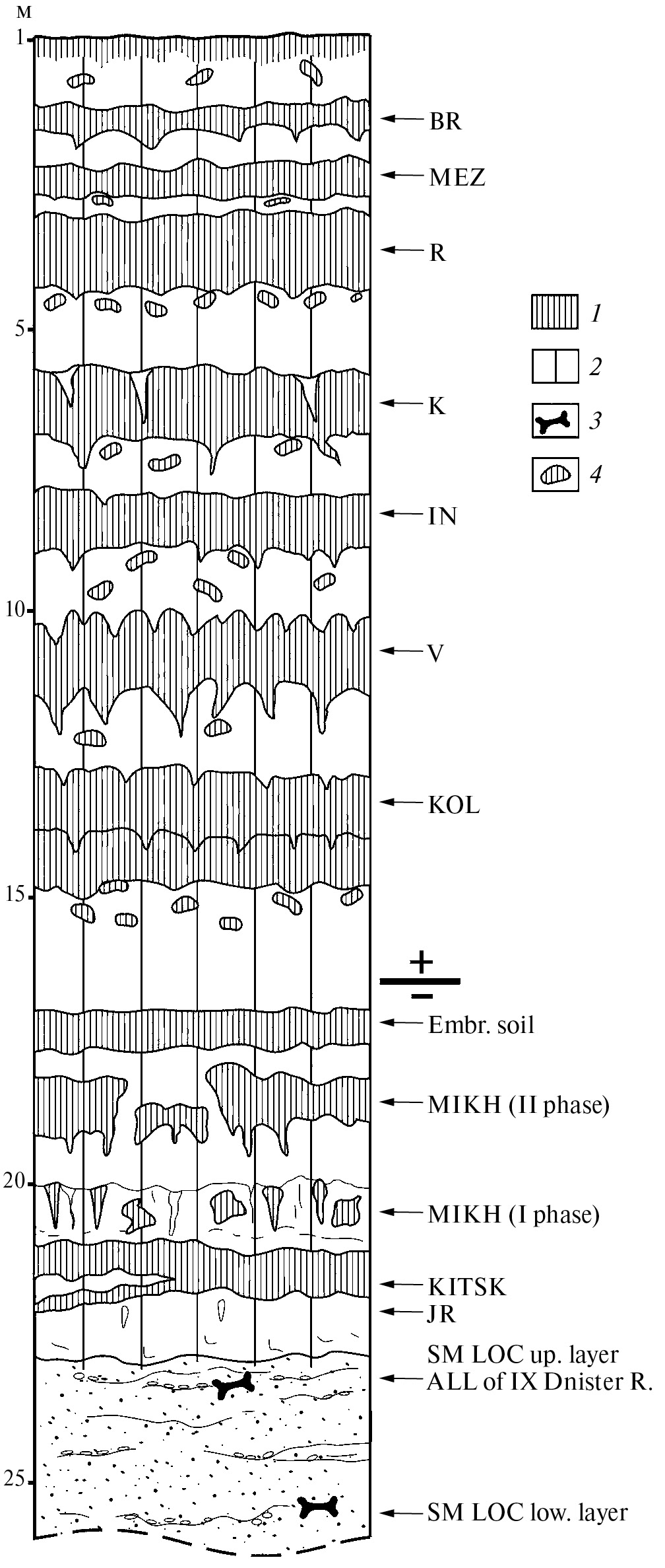 Рис. 2. Строение разреза Хаджимус (IX терраса Днестра) (по др. А. И. Цацкину, личное сообщение). BR — брянская ископаемая почва (МИС 3), MEZ — мезинский почвенный комплекс (МИС 5е), RM — роменская ископаемая почва (МИС 7), KM — каменская ископаемая почва (МИС 9), INZH — инжавинская ископаемая почва (МИС 11), VOR — воронская ископаемая почва (МИС 15), KOL — колкотовская ископаемая почва (МИС 17), Embr. soil -эмбриональная почва, MIKH (II phase) — михайловская почва (вторая фаза) (МИС 19), MIKH (I phase) — михайловская почва (I фаза) (МИС 21), KITSK — кицканская почва (МИС?), SM LOC (up. layer) — местонахождение мелких млекопитающих (верх. сл.), ALL of IX Dniester terrace — аллювий IX террасы Днестра, SM LOC (low. layer) — местонахождение мелких млекопитающих (нижний слой), JR — палеомагнитный эпизод Харамилло. 1 — почва; 2 — лёсс; 3 — кости мелких млекопитающих; 4 — кротовина.