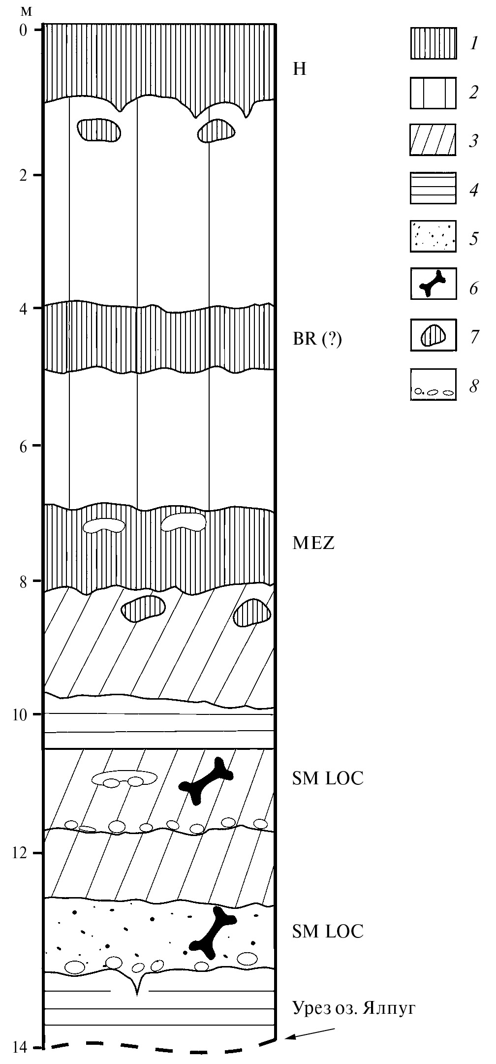 Рис. 4. Разрез Новонекрасовка (II терраса Дуная). BR (?) — брянская ископаемая почва(?), MEZ — мезинская ископаемая почва, SM LOC — местонахождение мелких млекопитающих в карангатских лиманных отложениях Черного моря (МИС 5е). 1 — почва; 2 — лёсс; 3 — суглинок; 4 — глина; 5 — песок; 6 — кости мелких млекопитающих; 7 — кротовина; 8 — гравелит.