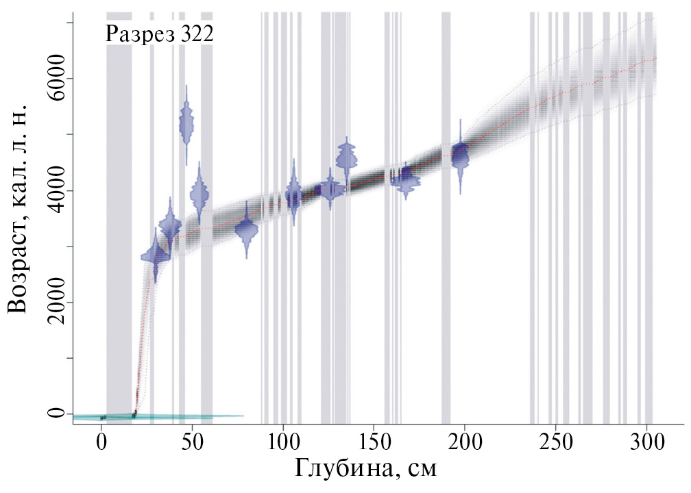 Возрастная модель показала, что три ¹⁴C-даты (LU-10757, LU-10758, LU-10762) являются удревленными (рис. 3), вероятно, в наводнения эродировался и переносился более древний органогенный материал. Скорости торфонакопления были довольно равномерными — 0.6—0.8 мм/г. и резко снижаются (до 0.03 мм/г) с 2820 лет.