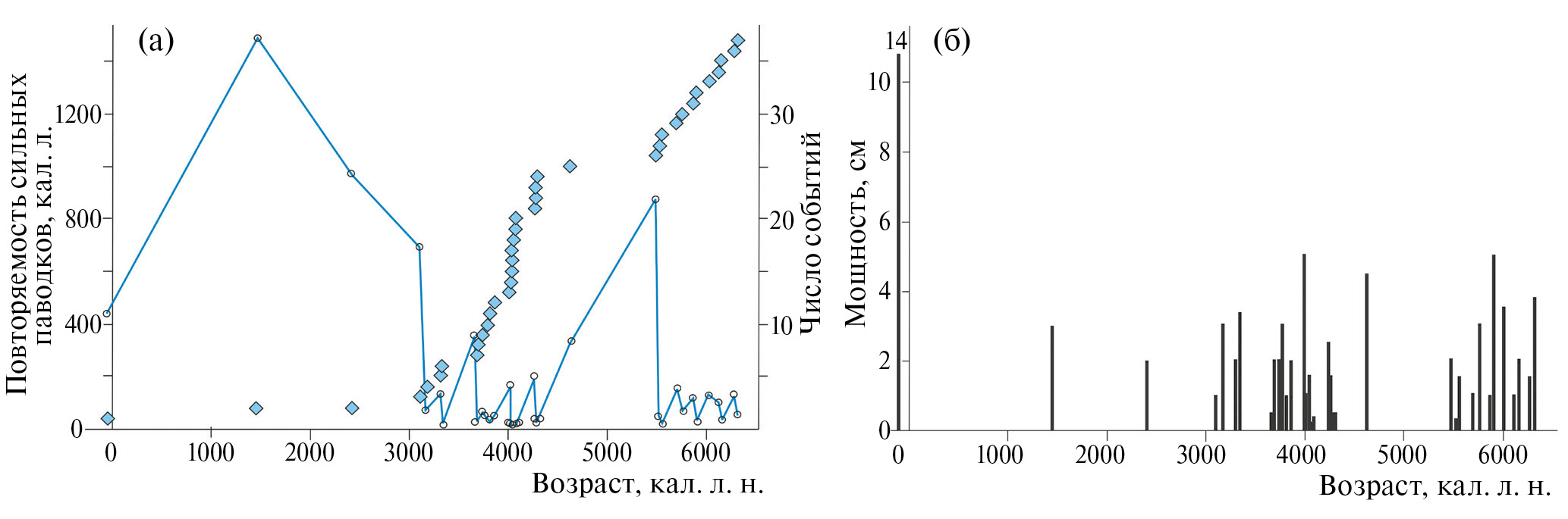 Хронология событий и палеоклиматический фон. Выделяются несколько периодов с разной повторяемостью и интенсивностью паводков. В конце среднего голоцена (6470—5490 л. н.) сильные паводки проходили довольно регулярно (рис. 4). Выделено 12 событий, проходивших с повторяемостью 30—40 лет и 100—150 лет. Климат Южного Сахалина, восстановленный на основе данных спорово-пыльцевого анализа, в это время отличался нестабильностью условий и резкой сменой более влажных и более сухих периодов (Микишин, Гвоздева, 2018). Прохождение сильных паводков фиксируется и на Восточном Сахалине, где в изученном разрезе водораздельного торфяника резко меняется концентрация створок диатомей за счет терригенного разбавления и заметно увеличивается количество реофильных диатомей и поломанных створок, выносимых реками в наводнения в озеро-лагуну. Отдельных событий в терригенных отложениях здесь не было выделено (Razjigaeva et al., 2020).