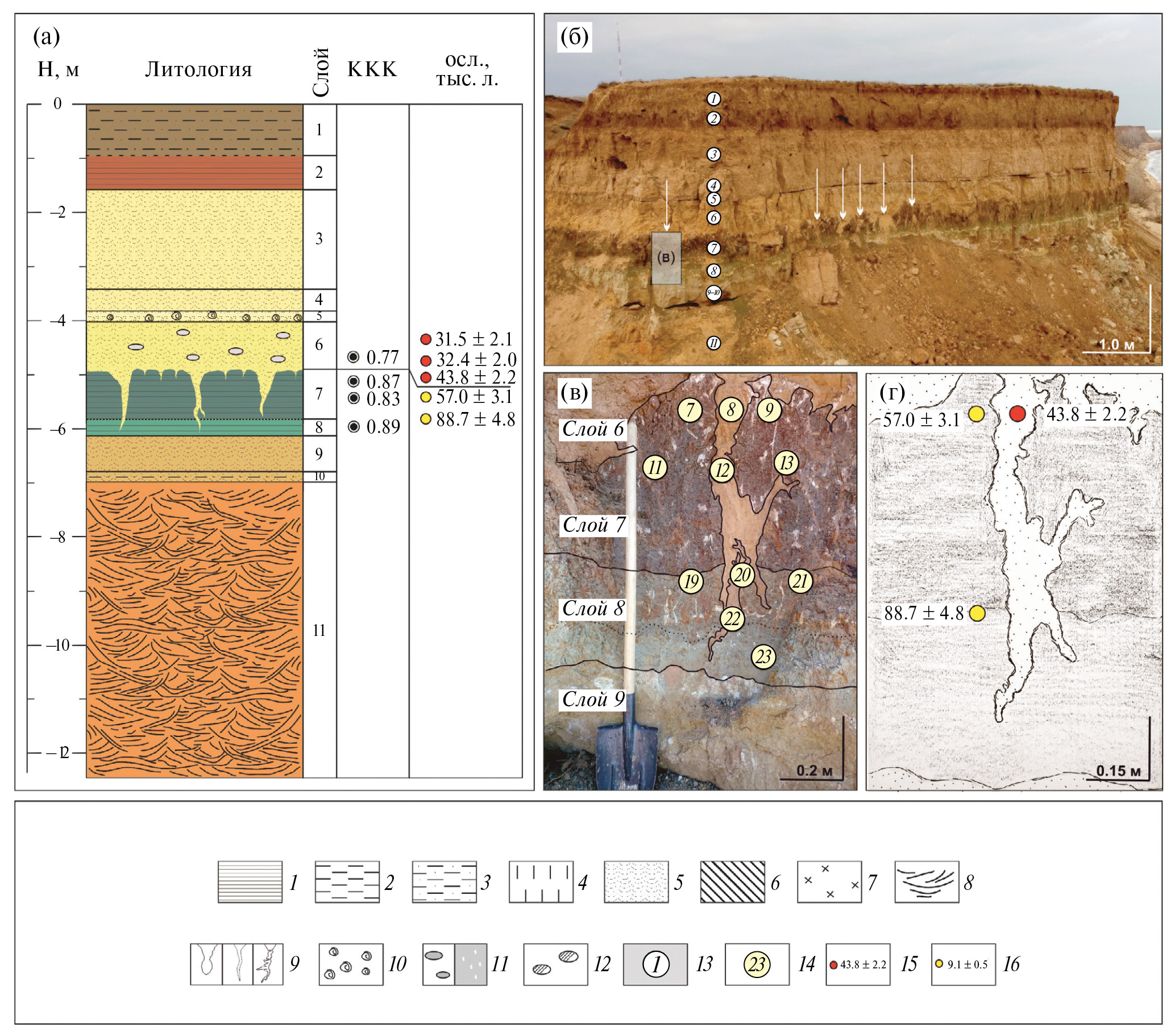 Fig. 2. Chernyy Yar section: (а) — the scheme of the — section with the coefficient of cryogenic contrast, OSL dating results, the color of the deposits reflects the natural color of the sediments; (б) — general view (white arrows show studied structures); (в) — sampled structure (numbers indicate sampling points for lithological analysis); (г) — sketch of the sampled structure with the results of OSL dating. 1 — clay; 2 — loam; 3 — sandy loam; 4 — loess; 5 — sand; 6 — redeposited sediment; 7 — paleosols; 8 — stratification; 9 — cryogenic-like structures; 10 — malacofauna; 11 — carbonates (concretions and admixtures); 12 — krotovinas; 13 — layers numbers; 14 — sampling points for lithological analyses; 15 — OSL age, ka (structures filler and overlying sediments); 16 — OSL age, ka (enclosing sediments).