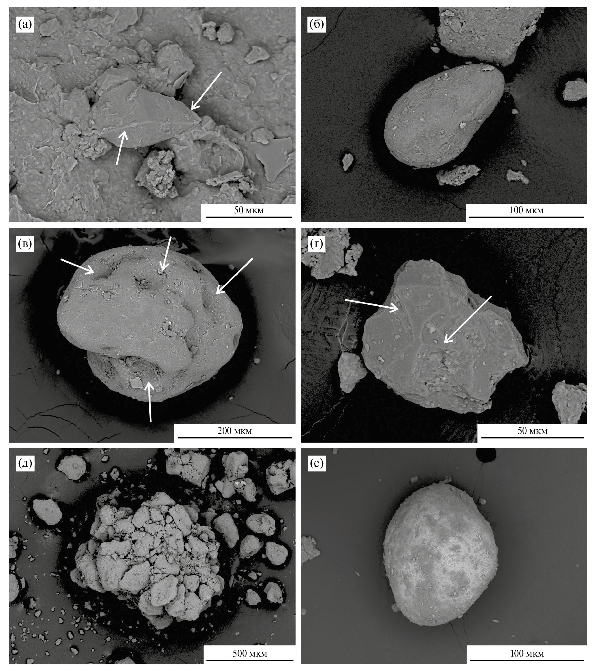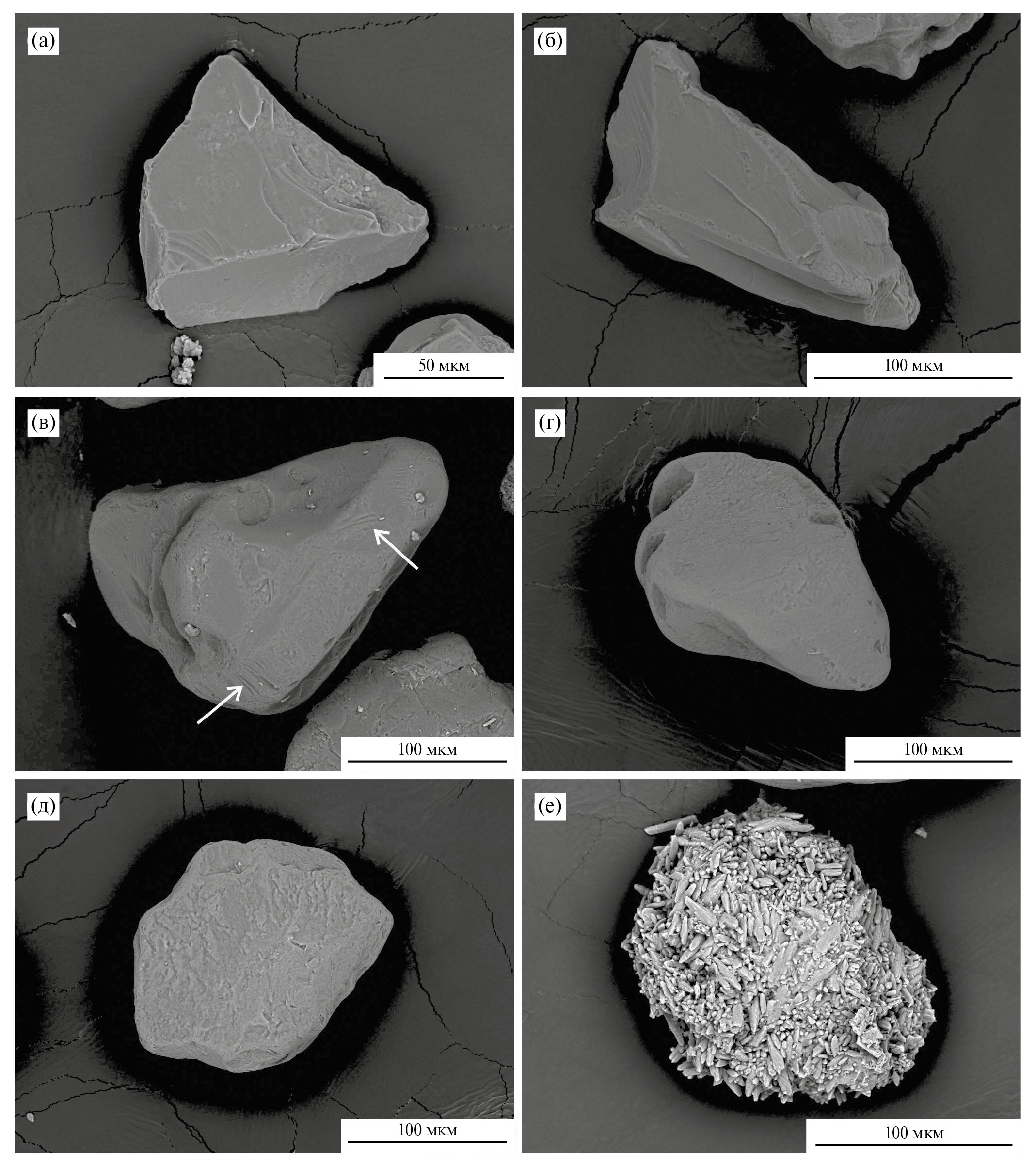 Рис. 4. Морфология кварцевых зерен и агрегатов вмещающих псевдоморфозу отложений (слои 7—8) разреза Черный Яр: (а) — угловатое зерно с раковистыми сколами; (б) — зерно со сколами и свежей поверхностью; (в) — угловатое зерно со сглаженными углами и параллельными бороздами (белые стрелки); (г) — вытянутое зерно со сглаженными гранями; (д) — следы травления на поверхности зерен; (е) — агрегат, сложенный кальцитом.