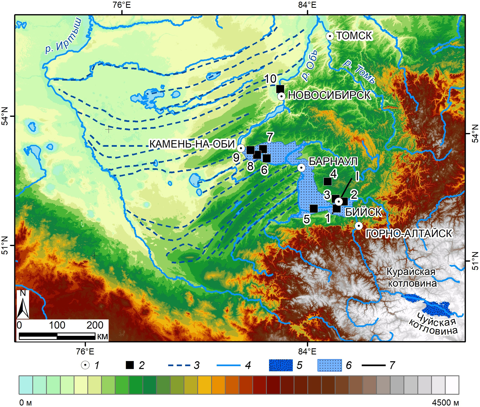1 – cities; 2 – reference sections (1 – Ikonnikovo, 2 – Biysk monastic strata (V fluvial terrace) in the base-ment of the Biysk terrace, 3 – Biysk (IV fluvial terrace), 4 – Bolshaya Rechka, 5 – Shcherbakovo, 6 – Meret, 7 – Malyshevo, 8 – Kargopolovo, 9 – Taradanovo, 10 – Krasny Yar); 3 – ancient valleys of super-flood runoff on the Ob–Irtysh interfluve; 4 – hydro grid; 5 – glacial–podprudnye paleoozers in the Chui and Kurai basins; 6 – temporary paleoozero super-flood breakthrough in the Biysk–Barnaul depression along the contours of the IV fluvial terrace; 7 – lines of sections through the Ob valley.