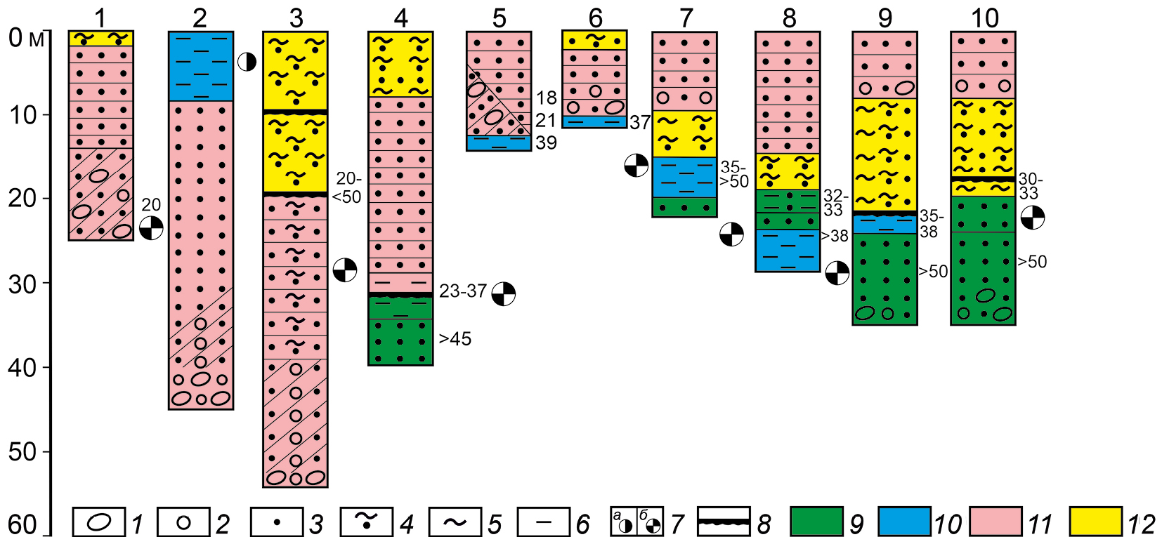 1 – boulders and pebbles; 2 – gravel; 3 – sand; 4 – aleuropes; 5 – siltstone; 6 – clay; 7 – locations of remains of large mammals (a – middle quaternary; б – upper quaternary); 8 – paleosols; genesis: 9 – alluvium, 10 – limnium, 11 – catafluvial; 12 – subaerial complex. Names of sections: 1 – Ikonnikovo; 2 – Biysk Monastery strata (V fluvial terrace) in the base of the Biysk terrace – drilling data on the bank of the Biya in the same place where the cliff section, designated № 3 – Biysk (IV fluvial terrace) – section of the cliff above the Biya level; 4 – Bolshaya Rechka; 5 – Shcherbakovo; 6 – Meret; 7 – Malyshevo; 8 – Kargopolovo; 9 – Taradanovo; 10 – Krasny Yar.