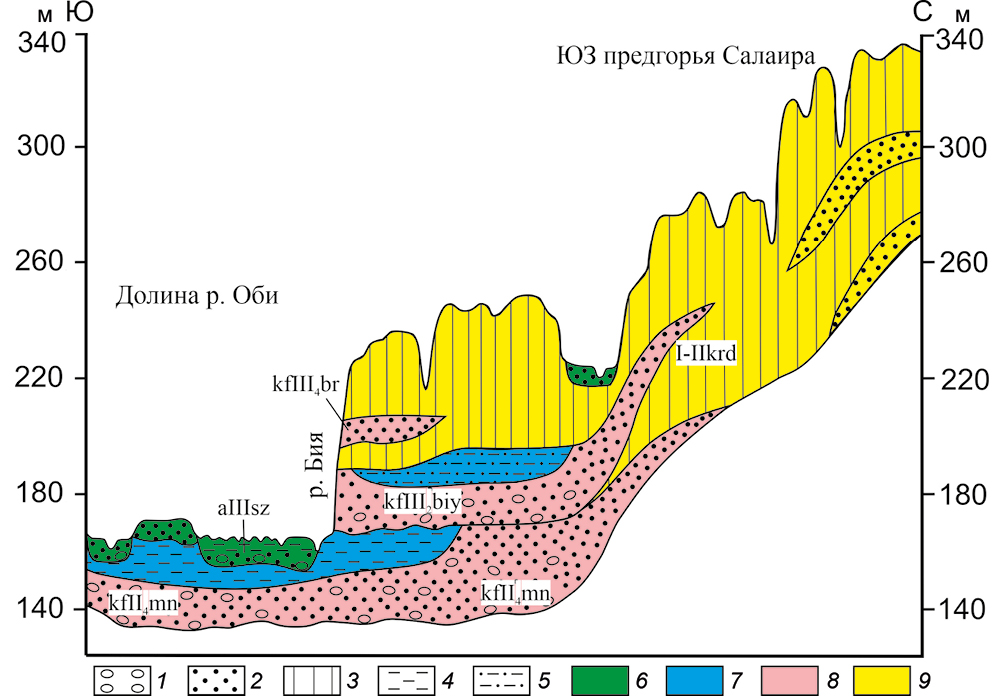 Бийская толща в стратотипическом разрезе представляет собой отложения мощностью до 35 м, в которых сверху вниз субгоризонтально параллельное переслаивание песков, алевропесков, алевритов сменяется косослоистыми песками, а затем гравийно-галечниками. В подошве этих отложений залегает базальный слой хорошо окатанных крупных валунов около 1 м в поперечнике. Нижняя пачка косослоистых гравийных песков, гравийников и галечников с валунами имеет мощность до 15–20 м и хорошо прослеживается по скважинам (рис. 3). Выше свита надстраивается пачками мелко “параллельно ленточно-слоистых” песков, алевропесков, алевритов. По данным бурения “мощность этой толщи при движении от р. Бии на север в сторону тылового шва постепенно увеличивается от 60 м до 100–120 м, превышая нормальную мощность такой реки как Бия в несколько раз” (Адаменко, 1974, с. 101). На наш взгляд, такая большая мощность и специфическая фациальная архитектура противоречит аллювиальному генезису, но вполне отвечает закономерностям формирования отложений суперпаводков.