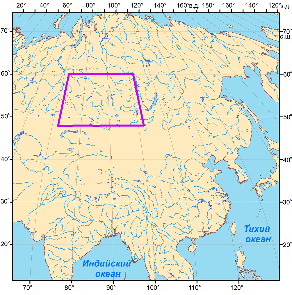 Западная Сибирь представляет собой крупный регион, который включает в себя Западно-Сибирскую равнину и обрамляющую ее с юга западную часть Алтае-Саянской горной области. Нами рассматривается значительная территория между 48 и 60° с.ш. 72 и 102° в.д., площадью 2 639 668 км² (рис. 1), включающая помимо юго-восточной четверти Западно-Сибирской равнины и большей части Алтае-Саянской горной области, примыкающие части Восточной Сибири и Казахстана. Вовлечение в рассмотрение сопредельных с Западной Сибирью территорий было сделано для того, чтобы не разрывать ряды рассматриваемых геоморфологических формаций. Рассмотрение формации катафлювиальных равнин юга Западной Сибири будет неполным без включения в рассматриваемую территорию района Дархатской впадины, где формировалось ледниково-подпрудное озеро, а формация пластовых равнин, выработанных в отложениях раннего и среднего кайнозоя и перекрытых чехлом верхнекайнозойских субаэральных отложений – без Казахского мелкосопочника, служившего областью поступления эолового материала для субаэрального чехла.