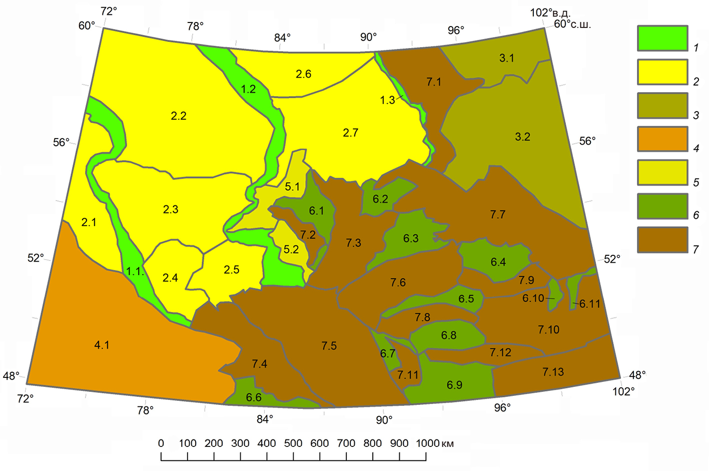 1 – river valleys (1.1 – Irtysh, 1.2 – Ob, 1.3 – Yenisei); 2 – plains (2.1 – Irtysh, 2.2 – Vasyugan, 2.3 – Baraba, 2.4 – Kulunda, 2.5 – Ob, 2.6 – Ketsko-Tym, 2.7 – Chulym); 3 – plateaus (3.1 – Zaangarskoe, 3.2 – Priangarskoe); 4 – low hills (4.1 – Kazakh); 5 – foothills (5.1 – Bugotaksko-Sokur, 5.2 – Chumysh); 6 – plains of large intermountain basins (6.1 – Kuznetsk, 6.2 – North Minusinsk, 6.3 – South Minusinsk, 6.4 – Todzhinsk, 6.5 – Tuva, 6.6 – Zaisan, 6.7 – Kyndyktykul-Achitnur, 6.8 – Ubsunur, 6.9 – Bolshie Ozeri, 6.10 – Darkhat, 6.11 – Tunka-Khubsugul); 7 – mountain structures (7.1 – Yenisei Ridge, 7.2 – Salair Ridge, 7.3 – Kuznetsk Alatau and Mountain Shoria, 7.4 – Rudny Altai, 7.5 – Russian (Mountain) and Mongolian Altai, 7.6 – Western Sayan, 7.7 – Eastern Sayan, 7.8 – Tannu-Ola, 7.9 – Academician Obrucheva, 7.10 – Selinga Highlands, 7.11 – Turgein-Nuru, 7.12 – Han-Hukhiin Ula, 7.13 – Hangai).