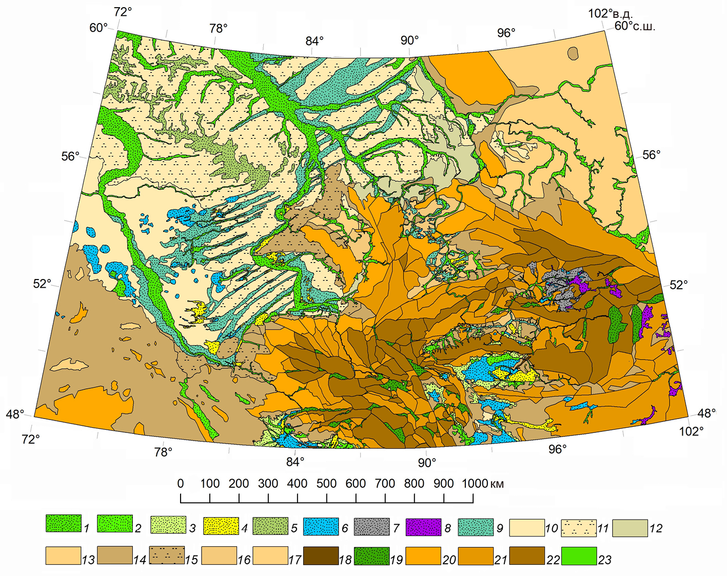 Аккумулятивные. Равнины: 1 – аллювиальные террасовые, 2 – аллювиально-пролювиальные, 3 – пролювиальные наклонные, 4 – песчаные эоловые, 5 – верховые болотные равнины, 6 – озерные, 7 – моренные, 8 – вулканогенные, 9 – катафлювиальные, 10 – малых межгорных котловин. Денудационные. Равнины: 11 – пластовые, выработанные в глинистых отложениях раннего и среднего кайнозоя, 12 – пластовые, выработанные в отложениях раннего и среднего кайнозоя и перекрытые чехлом верхнекайнозойских субаэральных отложений, 13 – наклонные, выработанные в породах среднего и верхнего мезозоя, 14 – структурные плато, выработанные в позднепалеозойских и мезозойских породах; мелкосопочник: 15 – денудационный, выработанный в палеозойских породах, 16 – денудационный, выработанный в палеозойских породах, перекрытый тонким чехлом верхнекайнозойских субаэральных отложений, 17 – куэстовый, выработанный в верхнепалеозойских и среднемезозойских породах, 18 – предгорий, выработанный в верхнепалеозойских, мезозойских и кайнозойских породах, 19 – линейный форбергов; горы: 20 – низкогорье, 21 – среднегорье, 22 – высокогорье; внезональные: 23 – транзитные эрозионные долины.