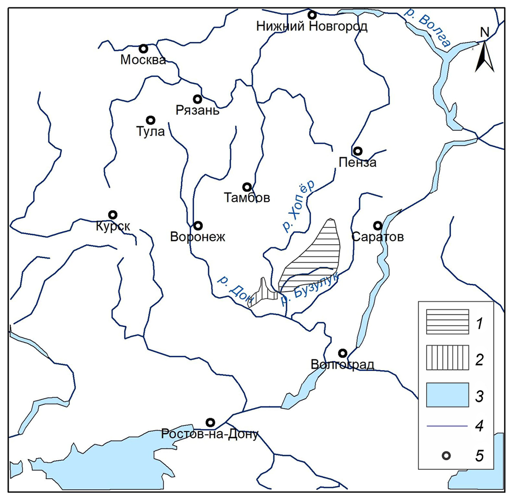 Fig. 1. Location of the studied river basins: 1 – Buzuluk basin (Khoper-Buzuluk lowland); 2 – basins rivers of the Kalach Upland; 3 – water bodies; 4 – rivers; 5 – cities.