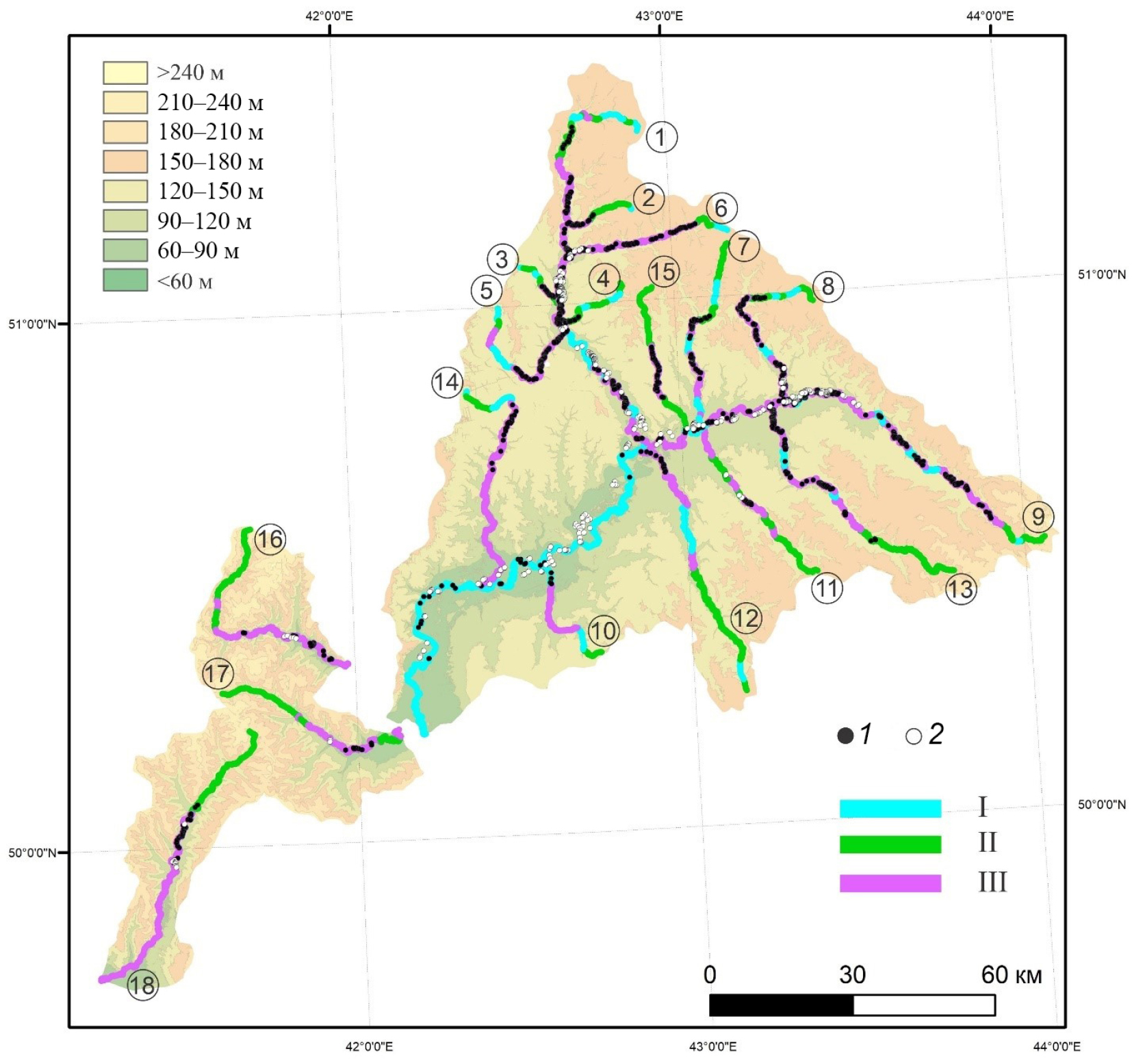 1 – чётки в основном русле водотока; 2 – чётки в старицах и вторичных рукавах. I – открытое (не заросшее) русло; II – полностью заросшее русло; III – частично заросшее русло. Номера рек приведены в соответствии с табл. 1.