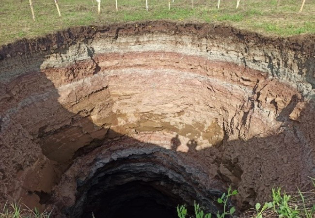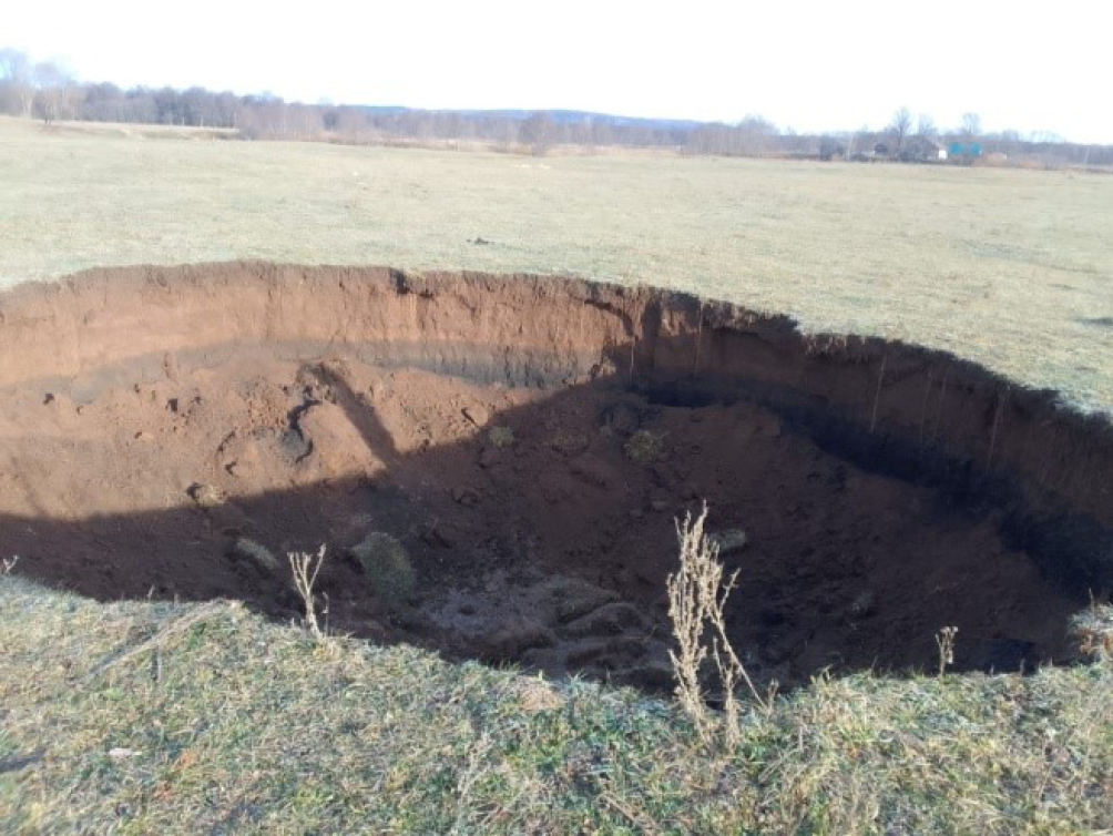 Рис. 1. Карстовый провал в 0.9 км северо-западнее д. Кигазытамаково (Мишкинский район РБ). Закрытый тип карста. Дата образования 03.05.2023. Фото ГУ МЧС по РБ.
