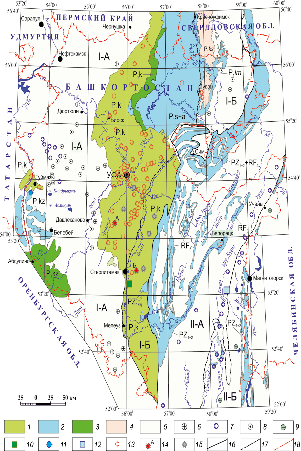 Карстовая страна Восточно-Европейской равнины (I): I-А – равнинный карст в горизонтально и пологозалегающих породах Предуралья; I-Б – равнинный и предгорный карст Предуралья в пологозалегающих и слабо дислоцированных породах. Уральская карстовая страна (II): II-А – горный и предгорный карст в сильно дислоцированных образованиях Урала; II-Б – равнинный карст в складчато-глыбовых отложениях Зауралья. Типы карста по составу карстующихся пород: 1 – сульфатный, 2 – карбонатный, 3 – сульфатно-карбонатный, 4 – кластокарст, 5 – территории с отсутствием карстопроявлений. Локальные проявления традиционных типов карста: 6 – сульфатного, 7 – карбонатного, 8 – кластокарста. Проявления нетрадиционных типов карста: 9 – сульфидного, 10 – соляного, 11 – известковых туфов, 12 – в мраморах, 13 – карстовые провалы современные с фиксированным временем образования. Нивально-коррозионные колодцы: 14 – участки с площадным распространением колодцев (карстовых полей): А – Аургазинский, Б – Селеукский; 15 – локальное (одиночное) распространение колодцев. Границы: 16 – карстовых стран, 17 – типов карста по характеру рельефа и условиям залегания пород, 18 – субъектов РФ.