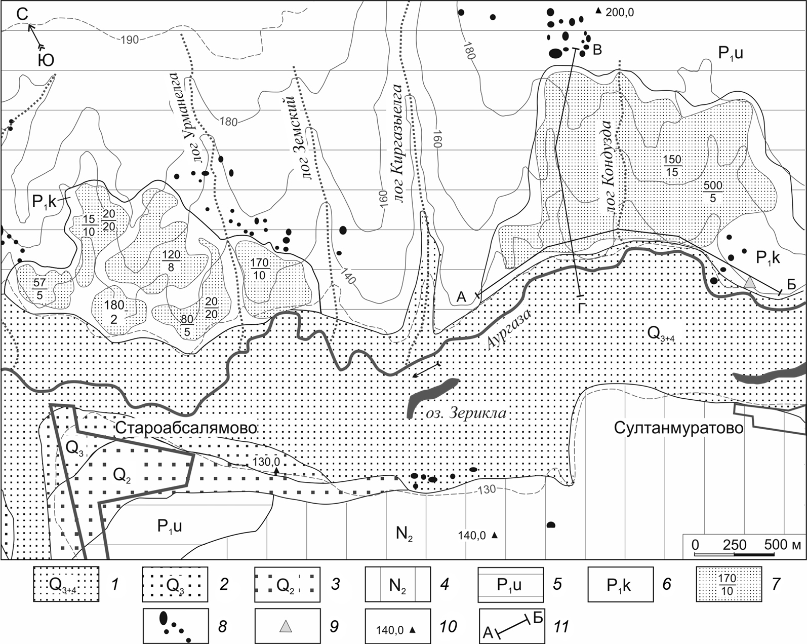Типы сульфатного карста по степени перекрытости карстующихся гипсов некарстующимися породами: перекрытый (подаллювиальный или камский) в днище долины р. Аургазы в пределах: 1 – поймы и первой нпт (голоцен и верхний плейстоцен), 2 – второй нпт (верхний и средний плейстоцен), 3 – третьей нпт (средний плейстоцен); 4 – покрытый в условиях залегания гипсов под суглинисто-глинистыми плиоценовыми отложениями, 5 – закрытый (русский) в условиях залегания гипсов под терригенно-карбонатными уфимскими породами, 6 – открытый (голый или средиземноморский) карст с участками прикрытого в условиях выхода гипсов кунгурского яруса на поверхность или прикрытия их маломощным (не более 3 м) чехлом элювиально-делювиальных четвертичных отложений. Поверхностные проявления карста: 7 – карстовое поле (количество воронок и колодцев на карстовом поле (числитель) и их средний диаметр (знаменатель)), 8 – отдельные карстовые воронки; 9 – родник; 10 – отметки абс. высот, м; 11 – линии профилей.