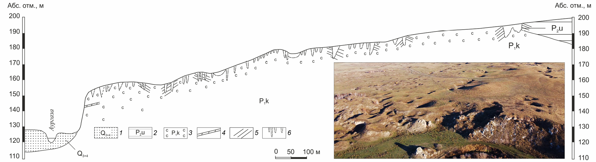 Долина р. Аургазы ассиметричная, с левым пологим склоном, плавно переходящим в междуречье, и правым крутым, местами обрывистым склоном высотой 30–40 м, расчлененным логами. Правый склон и придолинная часть междуречья сложены нижнепермскими гипсами кунгурского яруса и терригенно-карбонатными отложениями уфимского яруса, а левый – преимущественно суглинисто-глинистыми отложениями плиоцена. Днище долины реки выполнено аллювиальными плейстоценовыми и голоценовыми образованиями (рис. 5).