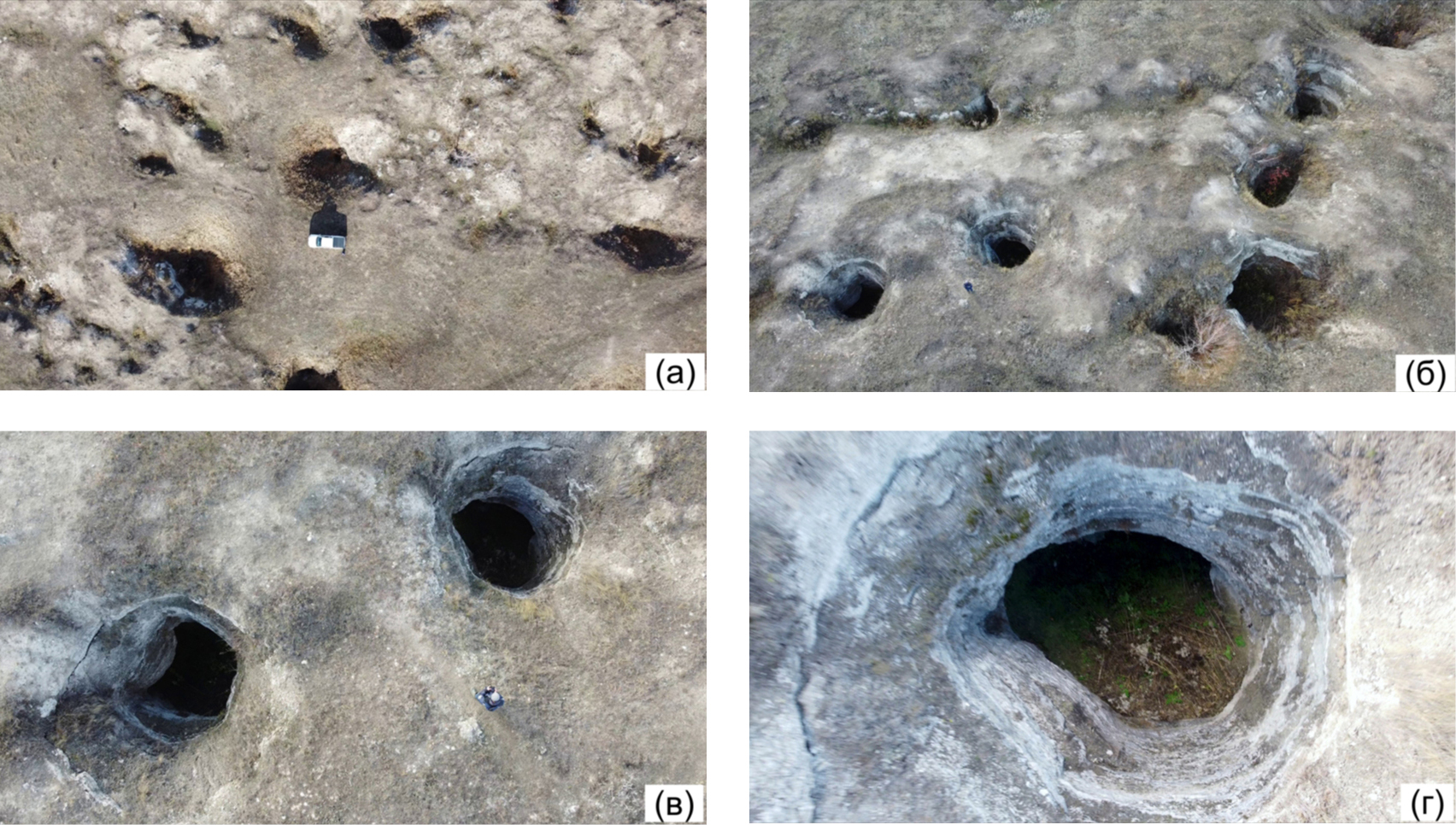 Fig. 8. Nival-corrosive wells at the Aurgazinskiy area: (а) and (б) – karst fields of wells, (в) and (г) – shape of wells. Photo by V.L. Mashin.