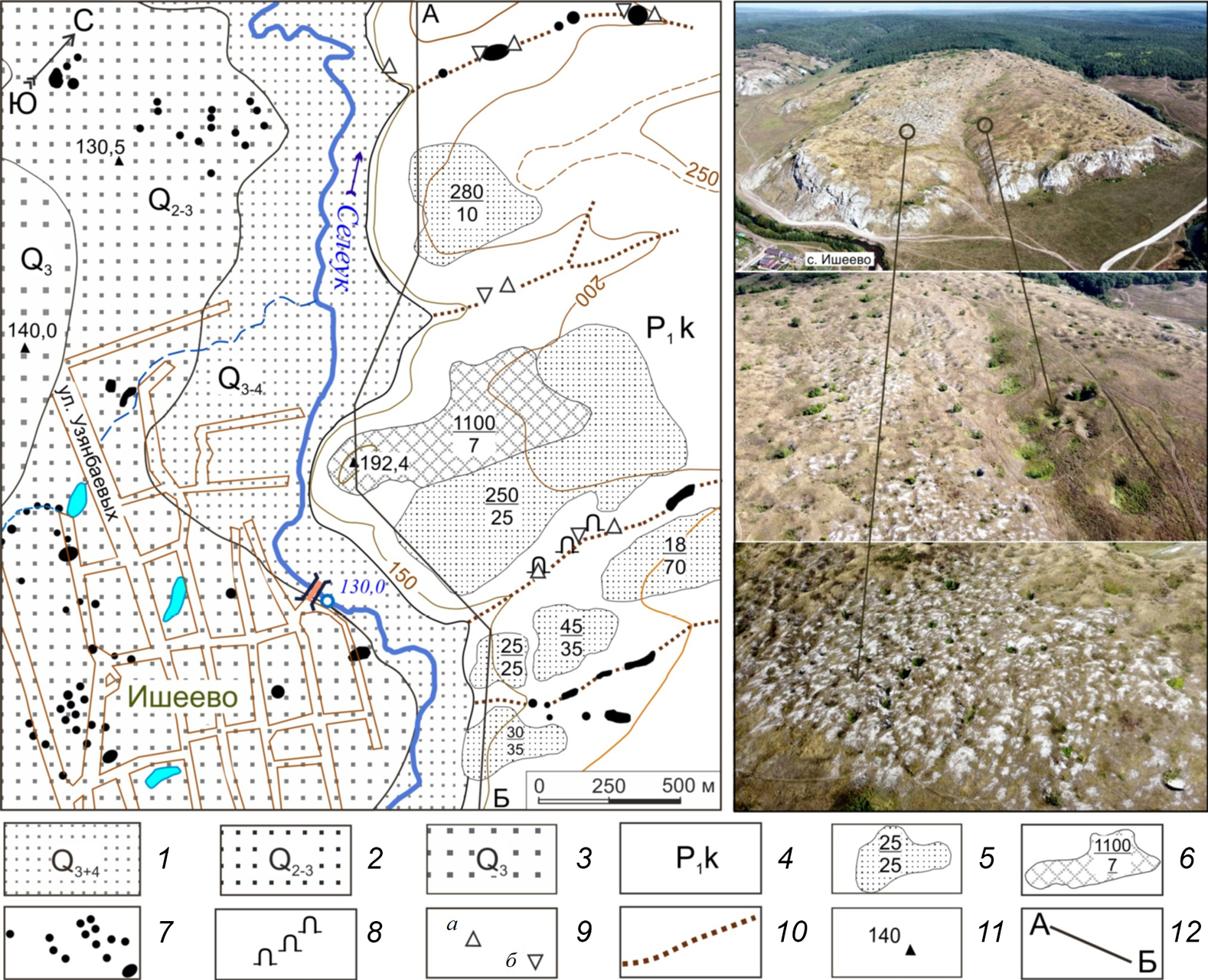 Types of sulfate karst according to the degree of overlap of karsted gypsum with non-karsted rocks: overlapped (suballuvial or Kama) in the bottom of the Seleuk River valley within the limits of: 1 – floodplain and first supra-floodplain terrace (Holocene and Upper Pleistocene), 2 – second supra-floodplain terrace (Upper and Middle Pleistocene), 3 – third supra-floodplain terrace (Middle Pleistocene); 4 – open (bare or Mediterranean) karst with areas of covered karst in the conditions of gypsums of the Kungurian stage reaching the surface or covered by a low thickness (not more than 3 m) cover of eluvial-deluvial Quaternary sediments. Surface manifestations of karst: 5 – karst field of sinkholes and wells, fraction in the field contours: numerator – number of sinkholes and wells (pcs.), denominator – their average diameter (m); 6 – karst field of nival-corrosive wells, fraction in the field contours: numerator – number of wells (pcs.), denominator – average diameter of wells (m); 7 – separate karst sinkholes; 8 – Isheevskaya cave system; 9 – water and water absorbing objects (a – spring, б – ponor); 10 – thalweg of erosion-karst log; 11 –marks of absolute heights (m); 12 – traverse А–Б line.