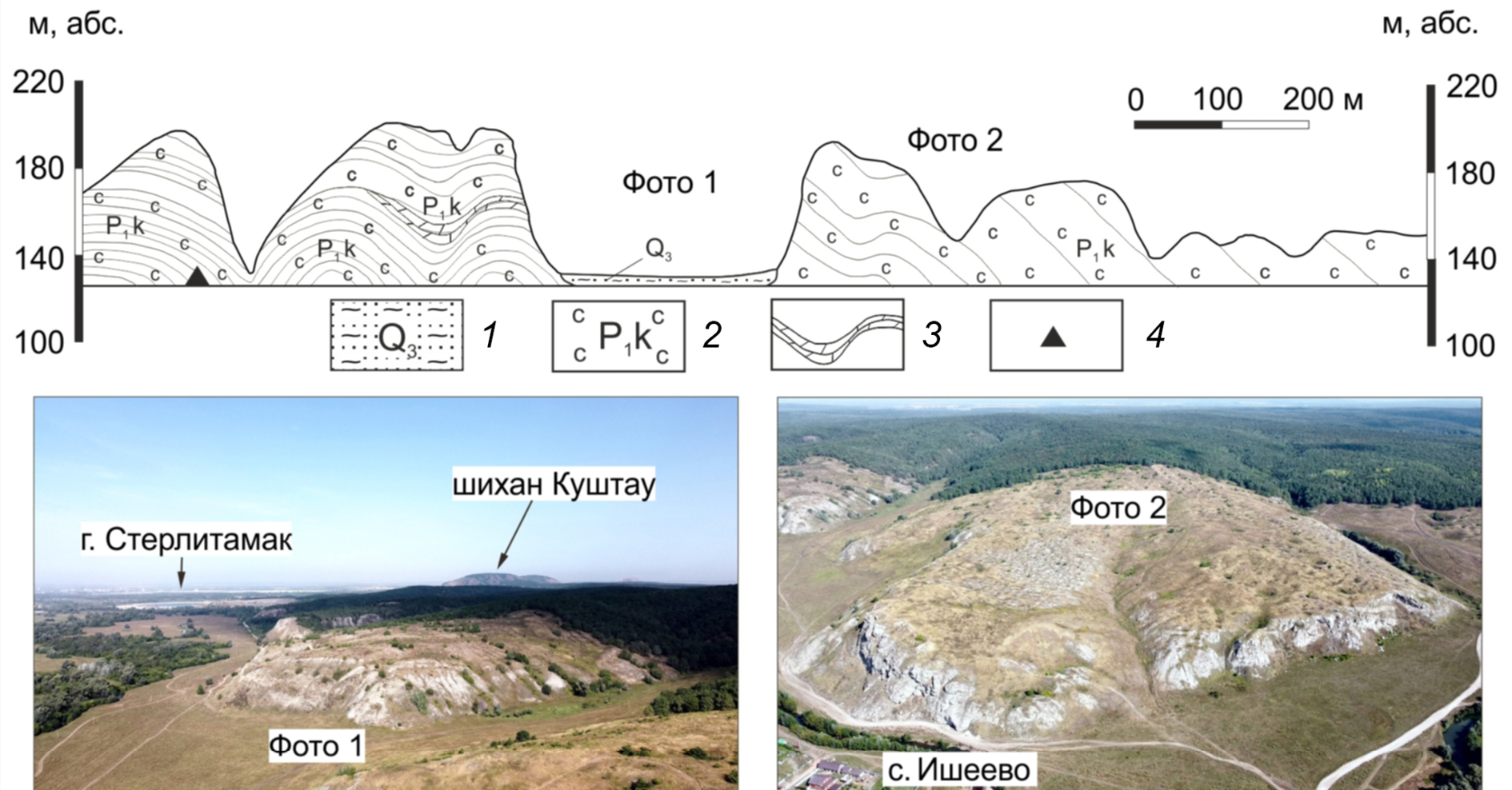 Fig. 10. Longitudinal section of the right slope of the Seleuk River valley along the А–Б line (by Smirnov, Sokolov, 2021). Photo by A.I. Smirnov (1), photo by V.L. Mashin (2).