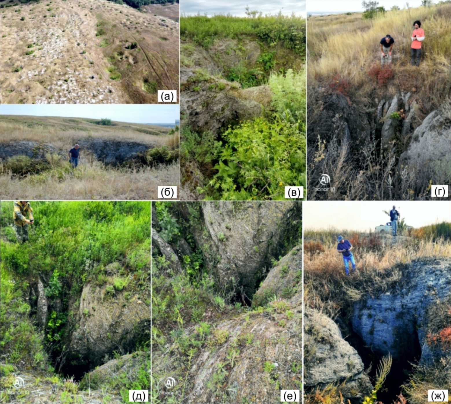 Рис. 11. Нивально-коррозионные колодцы в придолинной части водораздельного пространства по правобережью р. Селеук напротив с. Ишеево. Фото А.И. Смирнова. (а) – карстовое поле колодцев; (б) и (в) – перешейки между соседними колодцами; (г), (д), (е), (ж) – коррозионные желоба в бортах колодцев с различным поперечником.