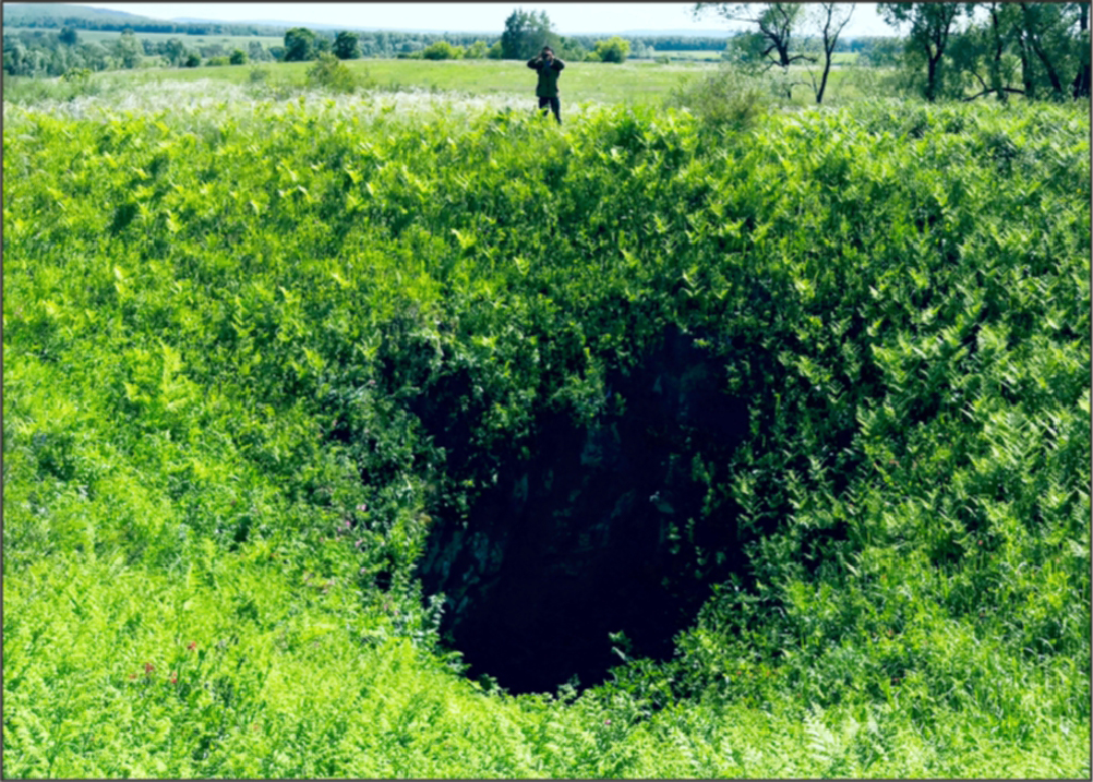 Карстово-гравитационные колодцы в Южном Предуралье распространены достаточно широко. Они представляют собой отрицательные формы рельефа, возникающие в результате обрушения сводов пустот и по сути своей являются провалами, обычно с крутонаклонными или отвесными бортами. Наиболее часто они встречаются в условиях закрытого и перекрытого типов карста (Смирнов, 2020), где карстующиеся породы залегают соответственно под терригенно-карбонатными уфимскими – русский тип карста (рис. 1), и аллювиальными четвертичными – камский тип карста (рис. 2) отложениями. Иногда провалы в условиях открытого карста служат входом в пещеру, и в этом случае они являются переходной от поверхностной к подземной форме карста (Соколов, 1962) (рис. 3).