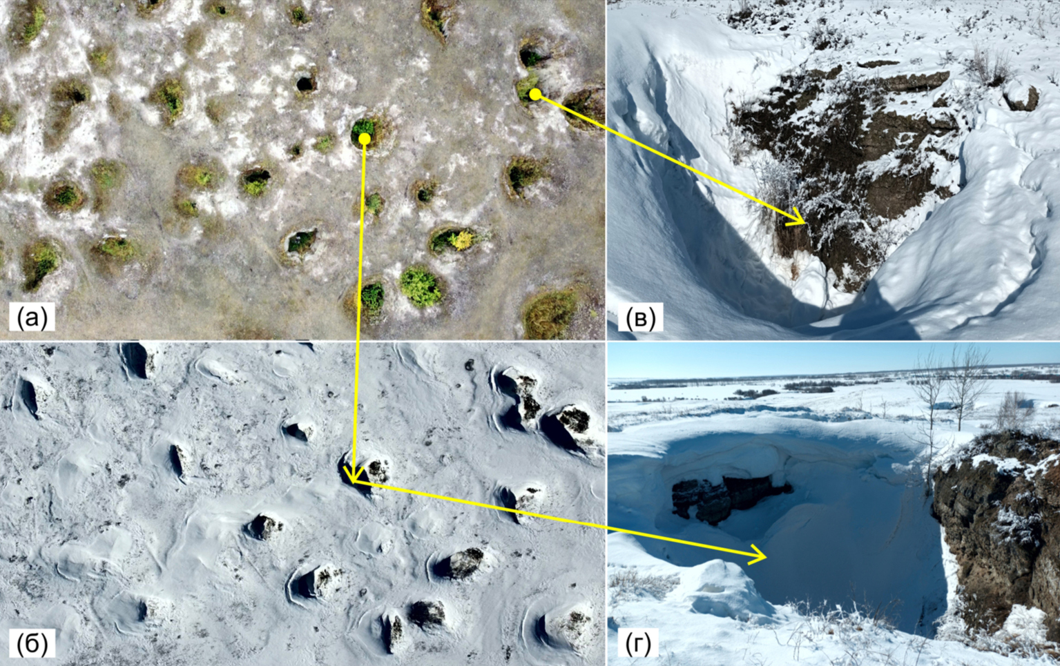 Fig. 14. A field of wells on the Aurgazinsk area. Karst well field: (а) – October 2022, (б) – March 2023; (в) and (г) – wells with snow in the sides and bottom in March 2023. Photo by V.L. Mashin (all photos are oriented from south to north).