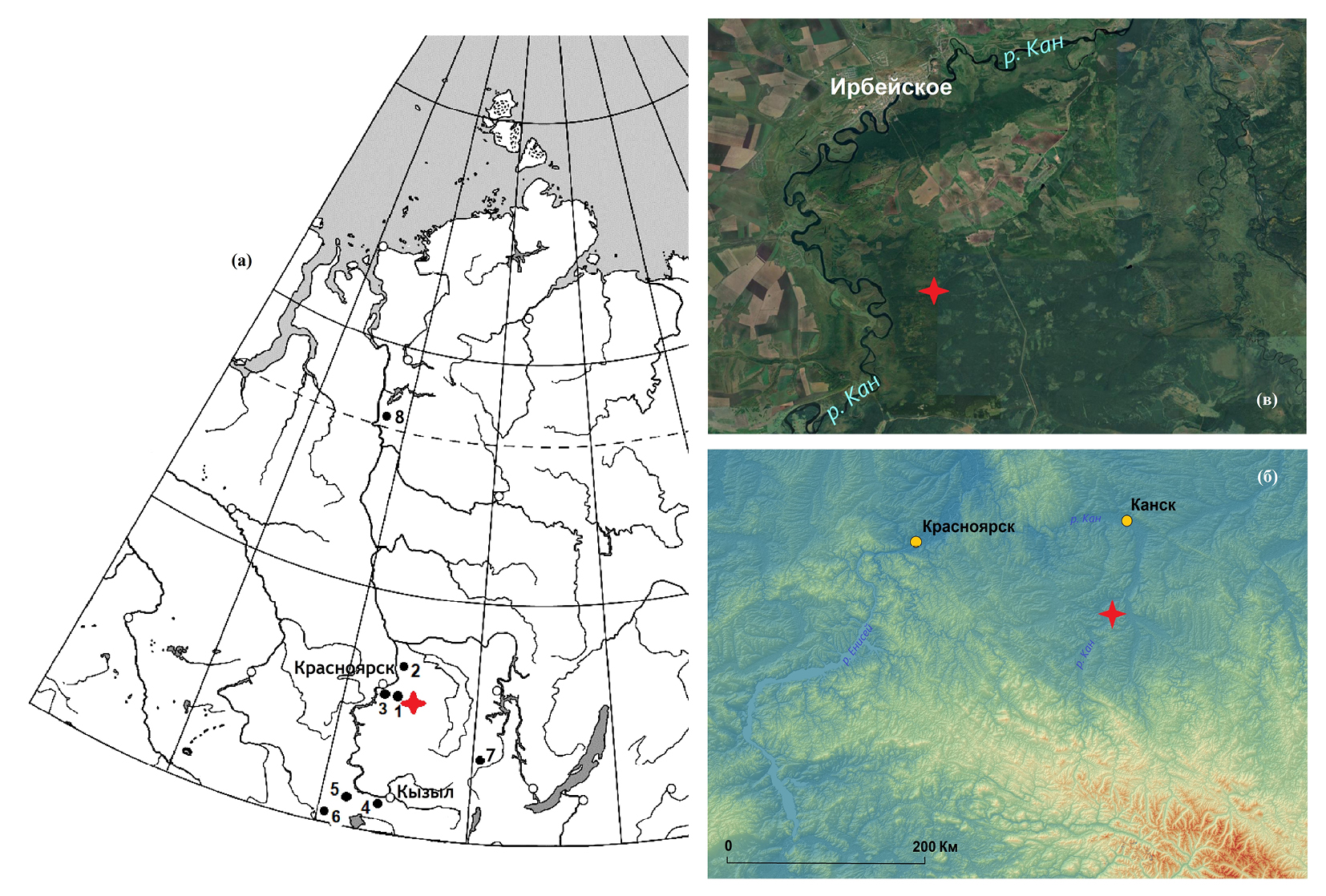 Рис. 1. Месторасположение района исследований. Звездочка – точка отбора торфяной колонки “Большое”. (а) – положение изучаемого региона, с указанием местоположения палеоархивов из литературных источников: 1 – болото Пинчинское (Mikhailova et al., 2021), 2 – болото Большое Сполошинское (Гренадерова и др., 2021), 3 – сталагмит в Торгашинской пещере (Columbu et al, 2023), 4 – древесно-кольцевая хронология Монгун (Мыглан и др., 2012), 5 – болото Малый Лабыш (Бляхарчук, Пупышева, 2022), 6 – р. М. Чили (Телецкое озеро) (Черных и др., 2014), 7 – торфяник “Ярма” (Безрукова, и др., 2004), 8 – болото в окрестностях г. Игарки (Новенко и др, 2022); (б) – карта рельефа юга Красноярского края (построена с помощью геоинформационной системы QGIS 3.32.3-Lima); (в) – положение изучаемого района (космоснимок).
