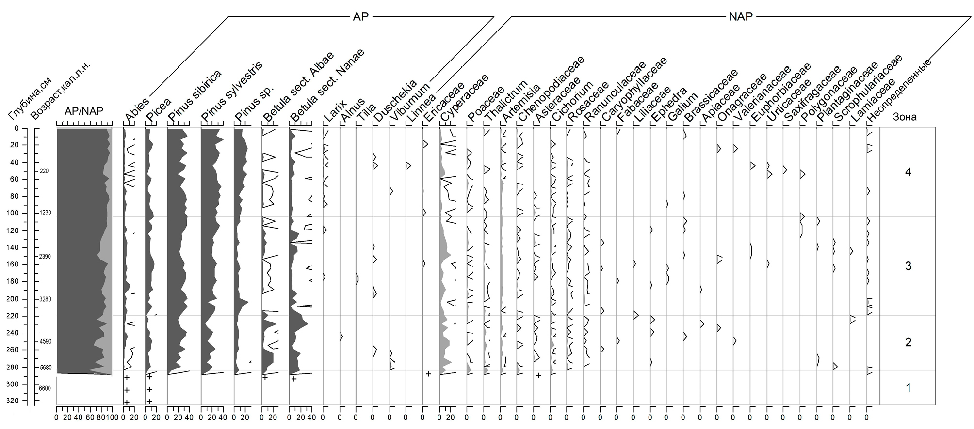 Зона 3 (220–105 см; 3720–1350 кал. л. н.). Пик пыльцы Abies до 10% на глубине 190–180 см. Содержание пыльцы Pinus sibirica в среднем составляет 30%, максимум до 36% в интервале 115–100 см и 200–195 см, Pinus sylvestris в среднем – 24%. Доля пыльца Betula sect. Nanae достигает 9–12% в интервале 215–190 см. На глубине 175–170 см и 120–115 см единично зафиксирована пыльца Larix. В интервале 180–175 см отмечается единично пыльца Tilia. Можно предположить, что это пыльца Tilia nasczokinii – единственного представителя широколиственных пород, сохранившегося с доледникового времени в Красноярском крае. В настоящее время отмечены две малочисленные изолированные популяции Tilia nasczokinii, которые произрастают в окрестностях Красноярска (Седаева и др., 2022). Из трав присутствует пыльца Cyperaceae, Cichorium, Chenopodiaceae, Poaceae, Rosaceae, Ranunculaceae, Thalictrum и Artemisia (не более 3% каждого таксона). Из спор доминируют Polypodiaceae, отмечаются споры Sphagnum и Bryales, единично Equisetum и Ophyoglossaceae.