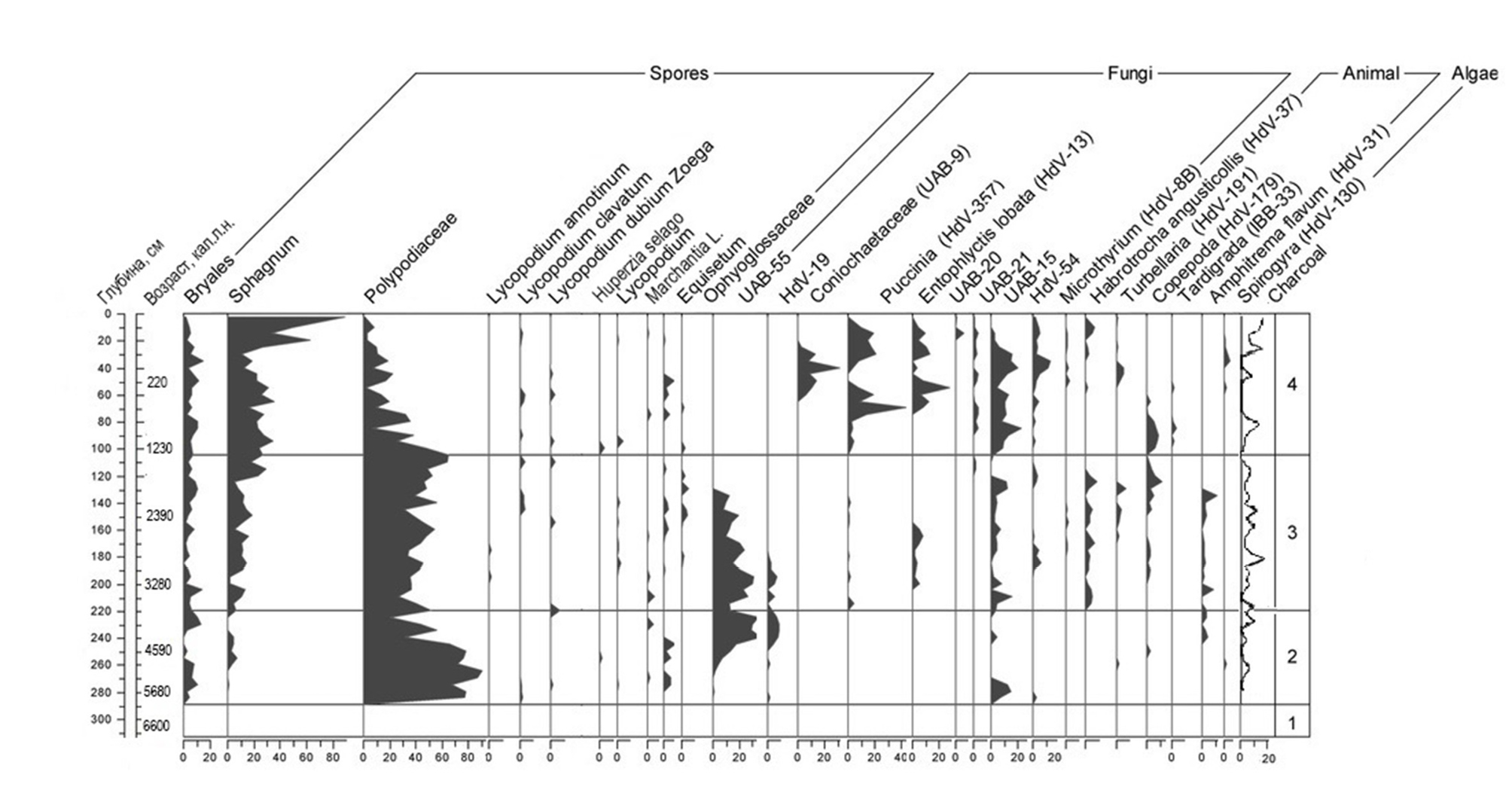 Далее на протяжении двух тысяч лет (6050–4230 кал. л. н.) на болоте был развит смешанный лес осоково-зеленомошный, пожарные эпизоды отсутствуют. В интервале 5680–5320 кал. л. н. имело место увеличение увлажнения, что отразилось в прослойке с высокой долей тканей травянистых и споровых растений в составе торфяного волокна, при сохранении доминирующей роли древесных. В слое отмечена НПП UAB-15, которая относится к грибам и встречается на заболоченных территориях (Revelles et al., 2016). Более обильно данная форма представлена позже, на топяной стадии развития болота Большое. На наш взгляд, участие НПП UAB-15 хорошо сопоставляется с увеличением доли макроостатков Carex lasiocarpa Ehrh. На плакорах, согласно данным спорово-пыльцевого анализа, произрастал елово-кедровый лес с пихтой, папоротниками и плаунами в напочвенном покрове, что в целом может свидетельствовать о значительном увлажнении. Высокое содержание папоротников в составе споровых приходится на период 5870–4410 кал. л. н., здесь же отмечается присутствие Lycopodium clavatum L. и Huperzia selago (L.) Bernh. ex Schrank & Mart., которые предпочитают влажные хвойные леса (Флора Сибири, 1988), единично отмечена НПП водоросль Spirogyra – индикатор мелководного застойного водоема (van Geel, 1978).