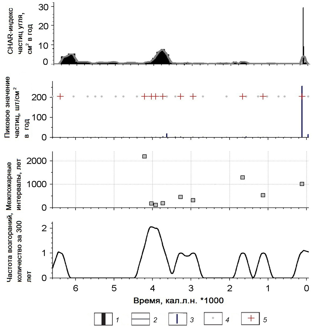 1 – contours of the interpolated charcoal influx; 2 – modeled background influx of charcoal, pcs./cm² year; 3 – charcoal peaks (the difference between the interpolated inflow value and the background inflow value); 4 – peaks not exceeding threshold; 5 – fire episode.
