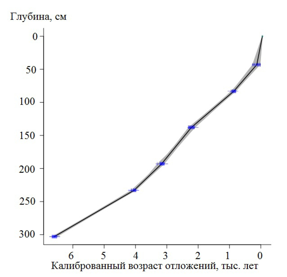 Радиоуглеродный анализ четырех образцов (табл. 1) проведен в ЦКП “Лаборатория радиоуглеродного датирования и электронной микроскопии” Института географии РАН и Центре прикладных изотопных исследований Университета Джорджии (США). Две пробы подготовлены и проанализорованы в Лаборатории изотопных исследований ЦКП “Геохронология кайнозоя” Института археологии и этнографии СО РАН и ЦКП “Ускорительная масс-спектрометрия НГУ-ННЦ”. Построение глубинно-возрастной модели (рис. 5) выполнено в пакете Clam программы R (Blaauw, 2010) при использовании калибровочной кривой IntCal20 (Reimer et al., 2020).