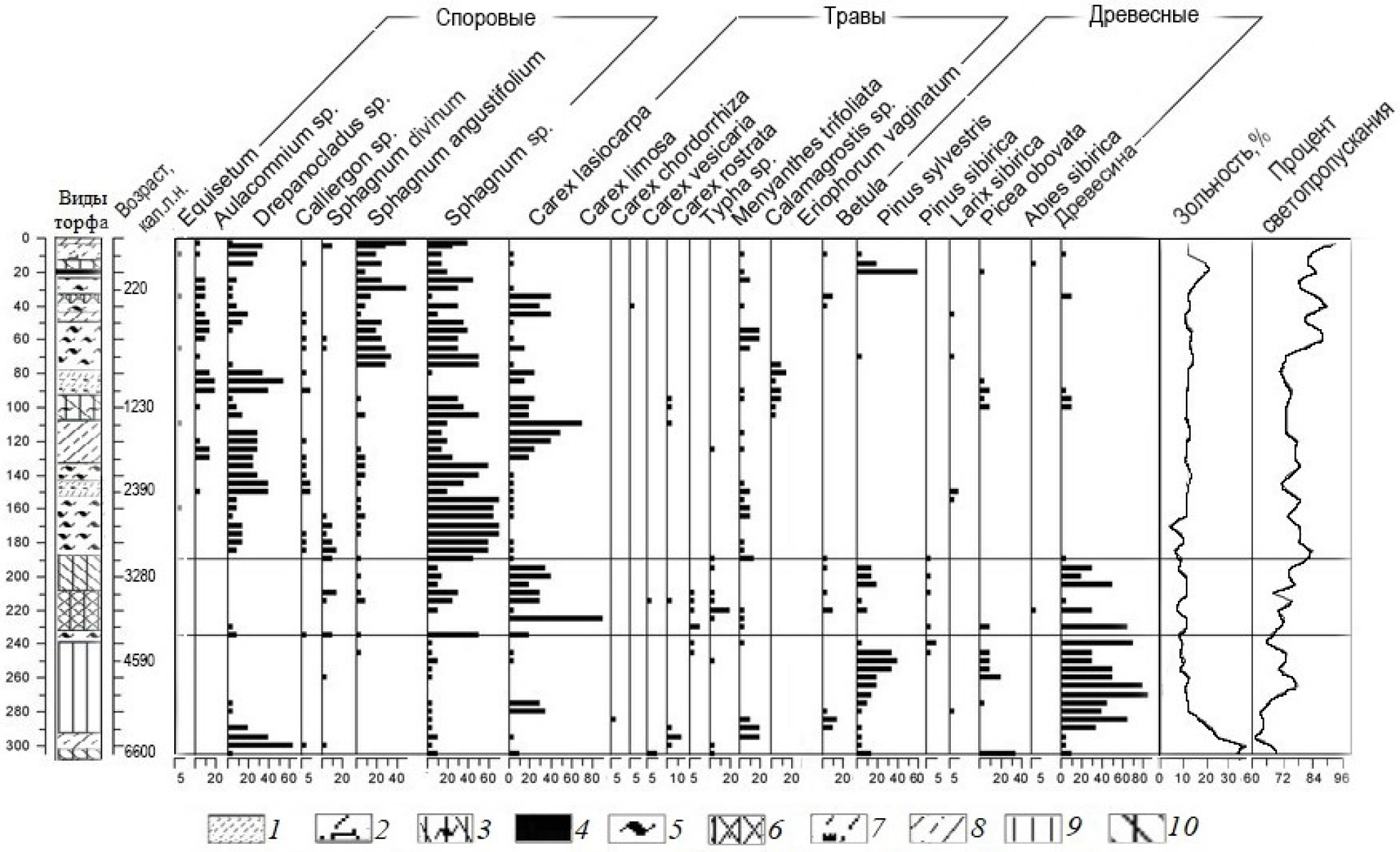 С 2820 по 2740 кал. л. н. единично отмечена пыльца Larix и споры Lycopodium annotinum, который встречается в лиственничных и еловых моховых лесах (Кожевников, 1986; Янченко, 2009). Для интервала 2740–2650 кал. л. н. характерно минимальное значение зольности – 4.32%, условия не способствовали привносу минеральных фракций поверхностным и подземным стоком. На 2650–2390 кал. л. н. приходится пик пыльцы ели – 13–15% (при среднем по разрезу содержании 8%), единично отмечен Lycopodium dubium – вид, характерный для тундры, лесотундры, изредко встречается в сосновых лесах (Флора Сибири, 1988). Перечисленные особенности можно соотнести с известным для умеренных широт северного полушария похолоданием около 2600 л. н. (Шнитников, 1957).